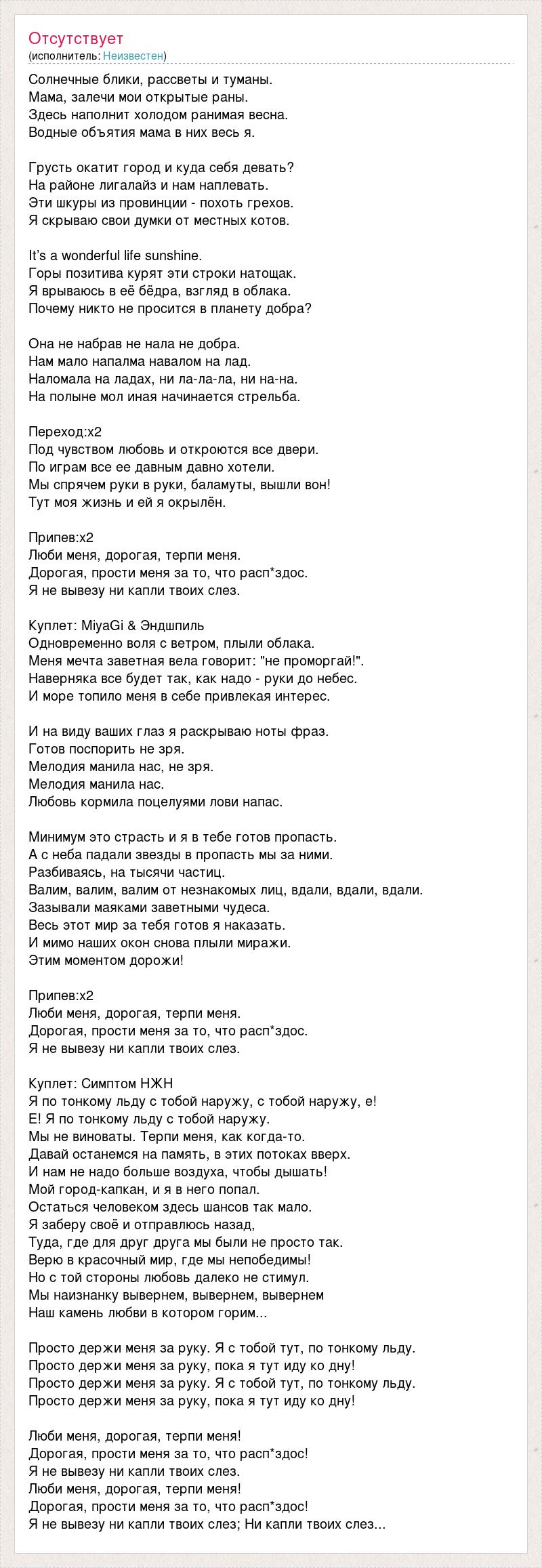 Солнечные блики, рассветы и туманы. Мама, залечи мои открытые раны. Здесь наполнит холодом ранимая весна. Водные объятия мама в них весь я. Грусть окатит город и куда себя девать? На районе лигалайз и нам наплевать. Эти шкуры из провинции - похоть грехов. Я скрываю свои думки от местных котов. It’s a wonderful life sunshine. Горы позитива курят эти строки натощак. Я врываюсь в её бёдра, взгляд в облака. Почему никто не просится в планету добра? Она не набрав не нала не добра. Нам мало напалма навалом на лад. Наломала на ладах, ни ла-ла-ла, ни на-на. На полыне мол иная начинается стрельба. Переход:х2 Под чувством любовь и откроются все двери. По играм все ее давным давно хотели. Мы спрячем руки в руки, баламуты, вышли вон! Тут моя жизнь и ей я окрылён. Припев:х2 Люби меня, дорогая, терпи меня. Дорогая, прости меня за то, что расп*здос. Я не вывезу ни капли твоих слез. Куплет: MiyaGi & Эндшпиль Одновременно воля с ветром, плыли облака. Меня мечта заветная вела говорит: "не проморгай!". Наверняка все будет так, как надо - руки до небес. И море топило меня в себе привлекая интерес. И на виду ваших глаз я раскрываю ноты фраз. Готов поспорить не зря. Мелодия манила нас, не зря. Мелодия манила нас. Любовь кормила поцелуями лови напас. Минимум это страсть и я в тебе готов пропасть. А с неба падали звезды в пропасть мы за ними. Разбиваясь, на тысячи частиц. Валим, валим, валим от незнакомых лиц, вдали, вдали, вдали. Зазывали маяками заветными чудеса. Весь этот мир за тебя готов я наказать. И мимо наших окон снова плыли миражи. Этим моментом дорожи! Припев:х2 Люби меня, дорогая, терпи меня. Дорогая, прости меня за то, что расп*здос. Я не вывезу ни капли твоих слез. Куплет: Симптом НЖН Я по тонкому льду с тобой наружу, с тобой наружу, е! Е! Я по тонкому льду с тобой наружу. Мы не виноваты. Терпи меня, как когда-то. Давай останемся на память, в этих потоках вверх. И нам не надо больше воздуха, чтобы дышать! Мой город-капкан, и я в него попал. Остаться человеком здесь шансов так мало. Я заберу своё и отправлюсь назад, Туда, где для друг друга мы были не просто так. Верю в красочный мир, где мы непобедимы! Но с той стороны любовь далеко не стимул. Мы наизнанку вывернем, вывернем, вывернем Наш камень любви в котором горим... Просто держи меня за руку. Я с тобой тут, по тонкому льду. Просто держи меня за руку, пока я тут иду ко дну! Просто держи меня за руку. Я с тобой тут, по тонкому льду. Просто держи меня за руку, пока я тут иду ко дну! Люби меня, дорогая, терпи меня! Дорогая, прости меня за то, что расп*здос! Я не вывезу ни капли твоих слез. Люби меня, дорогая, терпи меня! Дорогая, прости меня за то, что расп*здос! Я не вывезу ни капли твоих слез; Ни капли твоих слез...