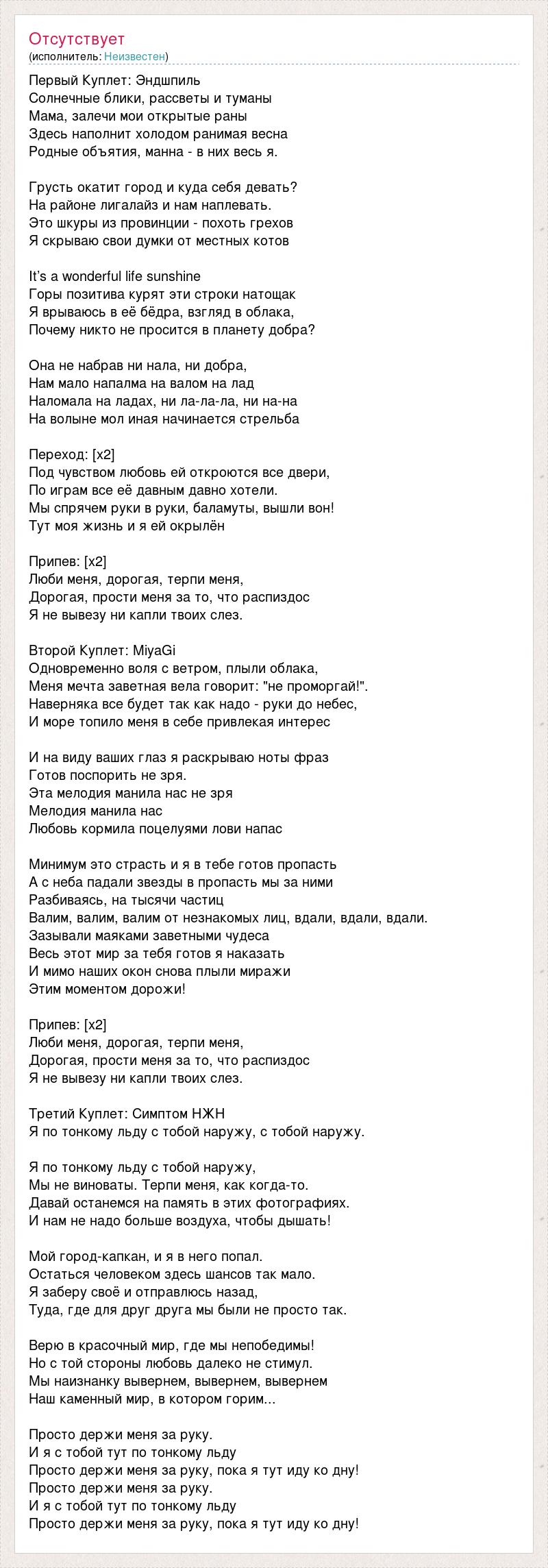 Первый Куплет: Эндшпиль Солнечные блики, рассветы и туманы Мама, залечи мои открытые раны Здесь наполнит холодом ранимая весна Родные объятия, манна - в них весь я. Грусть окатит город и куда себя девать? На районе лигалайз и нам наплевать. Это шкуры из провинции - похоть грехов Я скрываю свои думки от местных котов It’s a wonderful life sunshine Горы позитива курят эти строки натощак Я врываюсь в её бёдра, взгляд в облака, Почему никто не просится в планету добра? Она не набрав ни нала, ни добра, Нам мало напалма на валом на лад Наломала на ладах, ни ла-ла-ла, ни на-на На волыне мол иная начинается стрельба Переход: [х2] Под чувством любовь ей откроются все двери, По играм все её давным давно хотели. Мы спрячем руки в руки, баламуты, вышли вон! Тут моя жизнь и я ей окрылён Припев: [х2] Люби меня, дорогая, терпи меня, Дорогая, прости меня за то, что распиздос Я не вывезу ни капли твоих слез. Второй Куплет: MiyaGi Одновременно воля с ветром, плыли облака, Меня мечта заветная вела говорит: "не проморгай!". Наверняка все будет так как надо - руки до небес, И море топило меня в себе привлекая интерес И на виду ваших глаз я раскрываю ноты фраз Готов поспорить не зря. Эта мелодия манила нас не зря Мелодия манила нас Любовь кормила поцелуями лови напас Минимум это страсть и я в тебе готов пропасть А с неба падали звезды в пропасть мы за ними Разбиваясь, на тысячи частиц Валим, валим, валим от незнакомых лиц, вдали, вдали, вдали. Зазывали маяками заветными чудеса Весь этот мир за тебя готов я наказать И мимо наших окон снова плыли миражи Этим моментом дорожи! Припев: [х2] Люби меня, дорогая, терпи меня, Дорогая, прости меня за то, что распиздос Я не вывезу ни капли твоих слез. Третий Куплет: Симптом НЖН Я по тонкому льду с тобой наружу, с тобой наружу. Я по тонкому льду с тобой наружу, Мы не виноваты. Терпи меня, как когда-то. Давай останемся на память в этих фотографиях. И нам не надо больше воздуха, чтобы дышать! Мой город-капкан, и я в него попал. Остаться человеком здесь шансов так мало. Я заберу своё и отправлюсь назад, Туда, где для друг друга мы были не просто так. Верю в красочный мир, где мы непобедимы! Но с той стороны любовь далеко не стимул. Мы наизнанку вывернем, вывернем, вывернем Наш каменный мир, в котором горим... Просто держи меня за руку. И я с тобой тут по тонкому льду Просто держи меня за руку, пока я тут иду ко дну! Просто держи меня за руку. И я с тобой тут по тонкому льду Просто держи меня за руку, пока я тут иду ко дну!