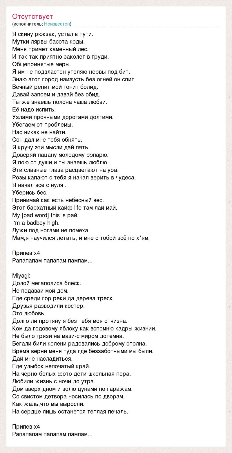 Я скину рюкзак, устал в пути. Мутки лярвы басота коды. Меня примет каменный лес. И так так приятно заколет в груди. Общепринятые меры. Я им не подвластен утоляю нервы под бит. Знаю этот город наизусть без огней он спит. Вечный репит мой гонит болид. Давай запоем и давай без обид. Ты же знаешь полона чаша любви. Её надо испить. Узлами прочными дорогами долгими. Убегаем от проблемы. Нас никак не найти. Сон дал мне тебя обнять. Я кручу эти мысли дай пять. Доверяй пацану молодому рэпарю. Я пою от души и ты знаешь люблю. Эти славные глаза расцветают на ура. Розы капают с тебя я начал верить в чудеса. Я начал все с нуля . Уберись бес. Принимай как есть небесный вес. Этот бархатный кайф life там лай май. My [bad word] this is рай. I'm a badboy high. Лужи под ногами не помеха. Мам,я научился летать, и мне с тобой всё по х*ям. Припев x4 Рапапапам папапам пампам... Miyagi: Долой мегаполиса блеск. Не подавай мой дом. Где среди гор реки да дерева треск. Друзья разводили костер. Это любовь. Долго ли протяну я без тебя моя отчизна. Ком да годовому яблоку как вспомню кадры жизнии. Не было грязи на мази-с миром дотемна. Бегали били колени радовались доброму сполна. Время верни меня туда где беззаботными мы были. Дай мне насладиться. Где улыбок непочатый край. На черно-белых фото дети-школьная пора. Любили жизнь с ночи до утра. Дом вверх дном и волю цунами по гаражам. Со свистом детвора носилась по дворам. Как жаль,что мы выросли. На сердце лишь останется теплая печаль. Припев x4 Рапапапам папапам пампам...