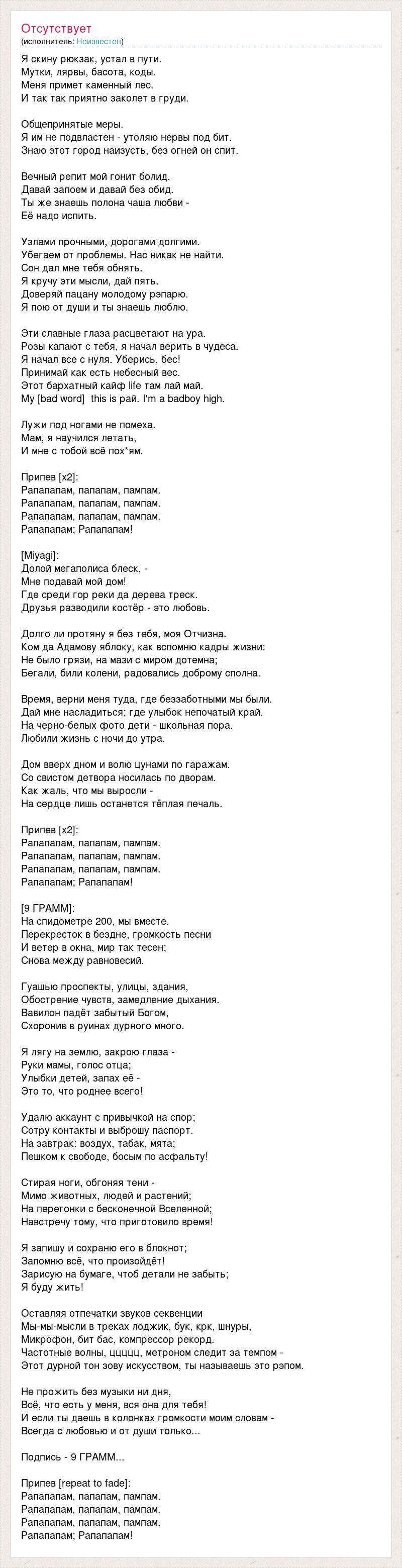 Я скину рюкзак, устал в пути. Мутки, лярвы, басота, коды. Меня примет каменный лес. И так так приятно заколет в груди. Общепринятые меры. Я им не подвластен - утоляю нервы под бит. Знаю этот город наизусть, без огней он спит. Вечный репит мой гонит болид. Давай запоем и давай без обид. Ты же знаешь полона чаша любви - Её надо испить. Узлами прочными, дорогами долгими. Убегаем от проблемы. Нас никак не найти. Сон дал мне тебя обнять. Я кручу эти мысли, дай пять. Доверяй пацану молодому рэпарю. Я пою от души и ты знаешь люблю. Эти славные глаза расцветают на ура. Розы капают с тебя, я начал верить в чудеса. Я начал все с нуля. Уберись, бес! Принимай как есть небесный вес. Этот бархатный кайф life там лай май. My [bad word] this is рай. I'm a badboy high. Лужи под ногами не помеха. Мам, я научился летать, И мне с тобой всё пох*ям. Припев [x2]: Рапапапам, папапам, пампам. Рапапапам, папапам, пампам. Рапапапам, папапам, пампам. Рапапапам; Рапапапам! [Miyagi]: Долой мегаполиса блеск, - Мне подавай мой дом! Где среди гор реки да дерева треск. Друзья разводили костёр - это любовь. Долго ли протяну я без тебя, моя Отчизна. Ком да Адамову яблоку, как вспомню кадры жизни: Не было грязи, на мази с миром дотемна; Бегали, били колени, радовались доброму сполна. Время, верни меня туда, где беззаботными мы были. Дай мне насладиться; где улыбок непочатый край. На черно-белых фото дети - школьная пора. Любили жизнь с ночи до утра. Дом вверх дном и волю цунами по гаражам. Со свистом детвора носилась по дворам. Как жаль, что мы выросли - На сердце лишь останется тёплая печаль. Припев [x2]: Рапапапам, папапам, пампам. Рапапапам, папапам, пампам. Рапапапам, папапам, пампам. Рапапапам; Рапапапам! [9 ГРАММ]: На спидометре 200, мы вместе. Перекресток в бездне, громкость песни И ветер в окна, мир так тесен; Снова между равновесий. Гуашью проспекты, улицы, здания, Обострение чувств, замедление дыхания. Вавилон падёт забытый Богом, Схоронив в руинах дурного много. Я лягу на землю, закрою глаза - Руки мамы, голос отца; Улыбки детей, запах её - Это то, что роднее всего! Удалю аккаунт с привычкой на спор; Сотру контакты и выброшу паспорт. На завтрак: воздух, табак, мята; Пешком к свободе, босым по асфальту! Стирая ноги, обгоняя тени - Мимо животных, людей и растений; На перегонки с бесконечной Вселенной; Навстречу тому, что приготовило время! Я запишу и сохраню его в блокнот; Запомню всё, что произойдёт! Зарисую на бумаге, чтоб детали не забыть; Я буду жить! Оставляя отпечатки звуков секвенции Мы-мы-мысли в треках лоджик, бук, крк, шнуры, Микрофон, бит бас, компрессор рекорд. Частотные волны, ццццц, метроном следит за темпом - Этот дурной тон зову искусством, ты называешь это рэпом. Не прожить без музыки ни дня, Всё, что есть у меня, вся она для тебя! И если ты даешь в колонках громкости моим словам - Всегда с любовью и от души только... Подпись - 9 ГРАММ... Припев [repeat to fade]: Рапапапам, папапам, пампам. Рапапапам, папапам, пампам. Рапапапам, папапам, пампам. Рапапапам; Рапапапам!