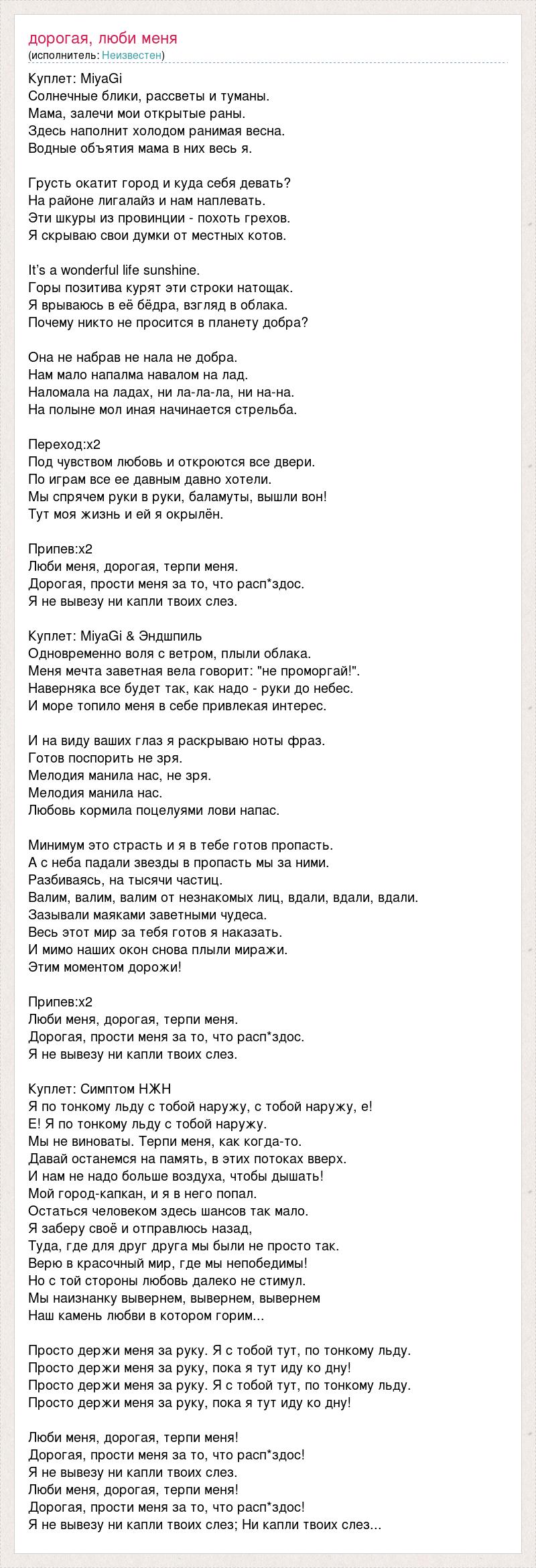 Куплет: MiyaGi Солнечные блики, рассветы и туманы. Мама, залечи мои открытые раны. Здесь наполнит холодом ранимая весна. Водные объятия мама в них весь я. Грусть окатит город и куда себя девать? На районе лигалайз и нам наплевать. Эти шкуры из провинции - похоть грехов. Я скрываю свои думки от местных котов. It’s a wonderful life sunshine. Горы позитива курят эти строки натощак. Я врываюсь в её бёдра, взгляд в облака. Почему никто не просится в планету добра? Она не набрав не нала не добра. Нам мало напалма навалом на лад. Наломала на ладах, ни ла-ла-ла, ни на-на. На полыне мол иная начинается стрельба. Переход:х2 Под чувством любовь и откроются все двери. По играм все ее давным давно хотели. Мы спрячем руки в руки, баламуты, вышли вон! Тут моя жизнь и ей я окрылён. Припев:х2 Люби меня, дорогая, терпи меня. Дорогая, прости меня за то, что расп*здос. Я не вывезу ни капли твоих слез. Куплет: MiyaGi & Эндшпиль Одновременно воля с ветром, плыли облака. Меня мечта заветная вела говорит: "не проморгай!". Наверняка все будет так, как надо - руки до небес. И море топило меня в себе привлекая интерес. И на виду ваших глаз я раскрываю ноты фраз. Готов поспорить не зря. Мелодия манила нас, не зря. Мелодия манила нас. Любовь кормила поцелуями лови напас. Минимум это страсть и я в тебе готов пропасть. А с неба падали звезды в пропасть мы за ними. Разбиваясь, на тысячи частиц. Валим, валим, валим от незнакомых лиц, вдали, вдали, вдали. Зазывали маяками заветными чудеса. Весь этот мир за тебя готов я наказать. И мимо наших окон снова плыли миражи. Этим моментом дорожи! Припев:х2 Люби меня, дорогая, терпи меня. Дорогая, прости меня за то, что расп*здос. Я не вывезу ни капли твоих слез. Куплет: Симптом НЖН Я по тонкому льду с тобой наружу, с тобой наружу, е! Е! Я по тонкому льду с тобой наружу. Мы не виноваты. Терпи меня, как когда-то. Давай останемся на память, в этих потоках вверх. И нам не надо больше воздуха, чтобы дышать! Мой город-капкан, и я в него попал. Остаться человеком здесь шансов так мало. Я заберу своё и отправлюсь назад, Туда, где для друг друга мы были не просто так. Верю в красочный мир, где мы непобедимы! Но с той стороны любовь далеко не стимул. Мы наизнанку вывернем, вывернем, вывернем Наш камень любви в котором горим... Просто держи меня за руку. Я с тобой тут, по тонкому льду. Просто держи меня за руку, пока я тут иду ко дну! Просто держи меня за руку. Я с тобой тут, по тонкому льду. Просто держи меня за руку, пока я тут иду ко дну! Люби меня, дорогая, терпи меня! Дорогая, прости меня за то, что расп*здос! Я не вывезу ни капли твоих слез. Люби меня, дорогая, терпи меня! Дорогая, прости меня за то, что расп*здос! Я не вывезу ни капли твоих слез; Ни капли твоих слез...