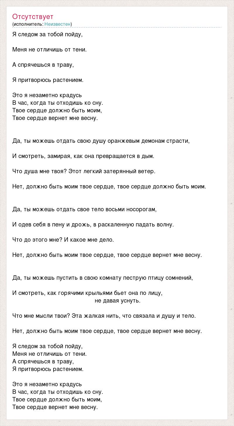 Нет, должно быть моим твое сердце, твое сердце вернет мне весну.