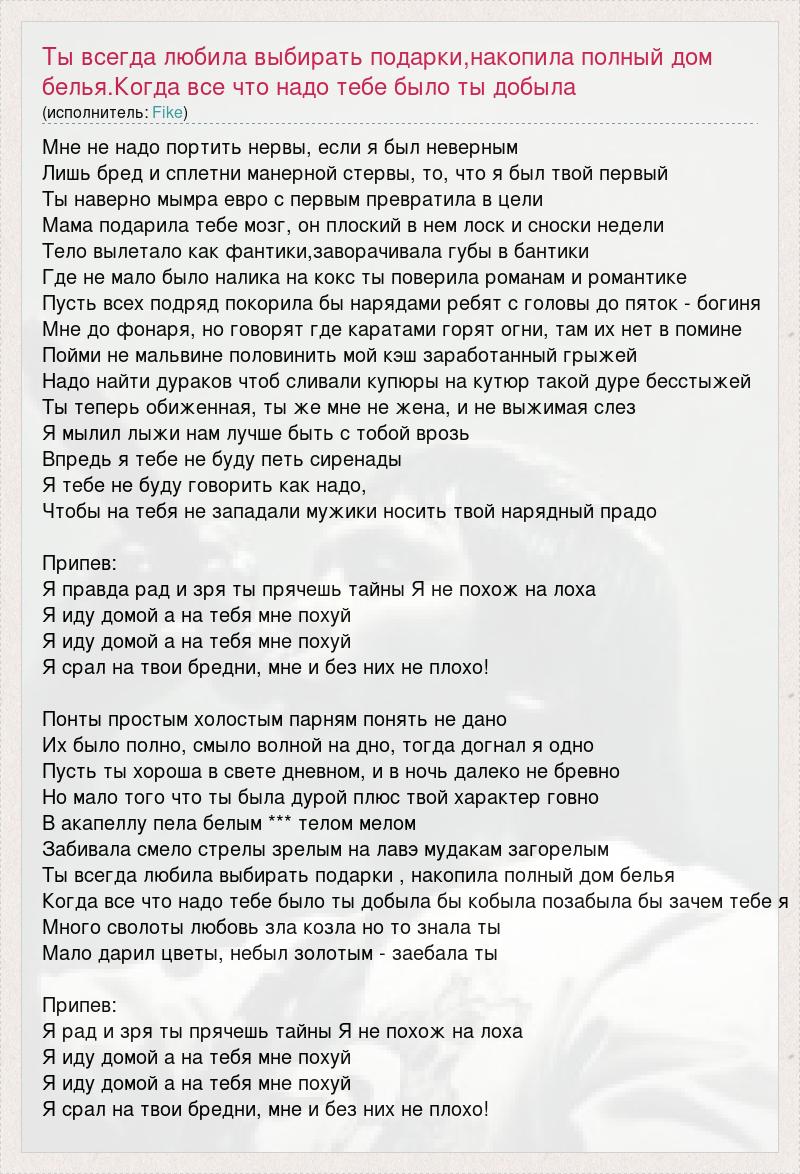Мне не надо портить нервы, если я был неверным Лишь бред и сплетни манерной стервы, то, что я был твой первый Ты наверно мымра евро с первым превратила в цели Мама подарила тебе мозг, он плоский в нем лоск и сноски недели Тело вылетало как фантики,заворачивала губы в бантики Где не мало было налика на кокс ты поверила романам и романтике Пусть всех подряд покорила бы нарядами ребят с головы до пяток - богиня Мне до фонаря, но говорят где каратами горят огни, там их нет в помине Пойми не мальвине половинить мой кэш заработанный грыжей Надо найти дураков чтоб сливали купюры на кутюр такой дуре бесстыжей Ты теперь обиженная, ты же мне не жена, и не выжимая слез Я мылил лыжи нам лучше быть с тобой врозь Впредь я тебе не буду петь сиренады Я тебе не буду говорить как надо, Чтобы на тебя не западали мужики носить твой нарядный прадо Припев: Я правда рад и зря ты прячешь тайны Я не похож на лоха Я иду домой а на тебя мне похуй Я иду домой а на тебя мне похуй Я срал на твои бредни, мне и без них не плохо! Понты простым холостым парням понять не дано Их было полно, смыло волной на дно, тогда догнал я одно Пусть ты хороша в свете дневном, и в ночь далеко не бревно Но мало того что ты была дурой плюс твой характер говно В акапеллу пела белым *** телом мелом Забивала смело стрелы зрелым на лавэ мудакам загорелым Ты всегда любила выбирать подарки , накопила полный дом белья Когда все что надо тебе было ты добыла бы кобыла позабыла бы зачем тебе я Много сволоты любовь зла козла но то знала ты Мало дарил цветы, небыл золотым - заебала ты Припев: Я рад и зря ты прячешь тайны Я не похож на лоха Я иду домой а на тебя мне похуй Я иду домой а на тебя мне похуй Я срал на твои бредни, мне и без них не плохо!