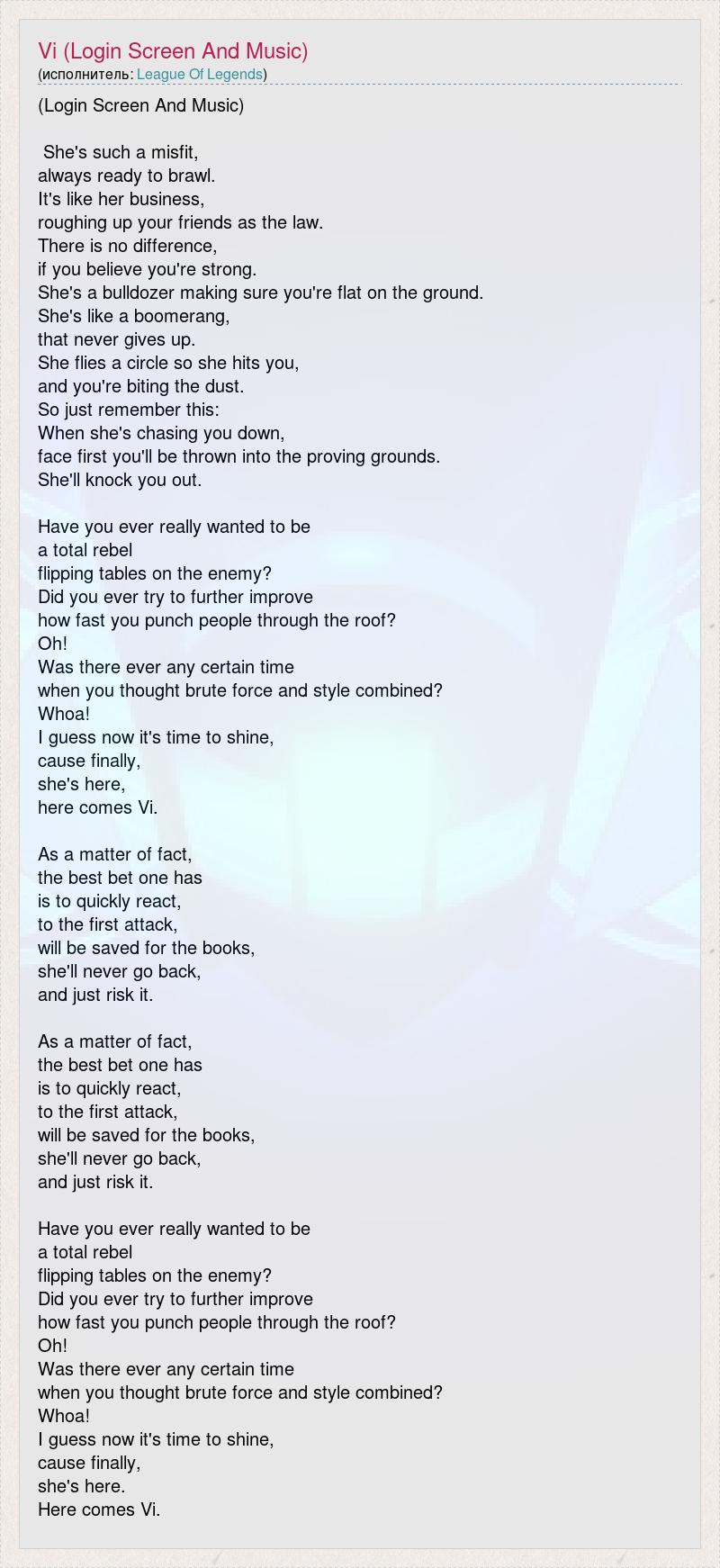 (Login Screen And Music) She's such a misfit, always ready to brawl. It's like her business, roughing up your friends as the law. There is no difference, if you believe you're strong. She's a bulldozer making sure you're flat on the ground. She's like a boomerang, that never gives up. She flies a circle so she hits you, and you're biting the dust. So just remember this: When she's chasing you down, face first you'll be thrown into the proving grounds. She'll knock you out. Have you ever really wanted to be a total rebel flipping tables on the enemy? Did you ever try to further improve how fast you punch people through the roof? Oh! Was there ever any certain time when you thought brute force and style combined? Whoa! I guess now it's time to shine, cause finally, she's here, here comes Vi. As a matter of fact, the best bet one has is to quickly react, to the first attack, will be saved for the books, she'll never go back, and just risk it. As a matter of fact, the best bet one has is to quickly react, to the first attack, will be saved for the books, she'll never go back, and just risk it. Have you ever really wanted to be a total rebel flipping tables on the enemy? Did you ever try to further improve how fast you punch people through the roof? Oh! Was there ever any certain time when you thought brute force and style combined? Whoa! I guess now it's time to shine, cause finally, she's here. Here comes Vi.