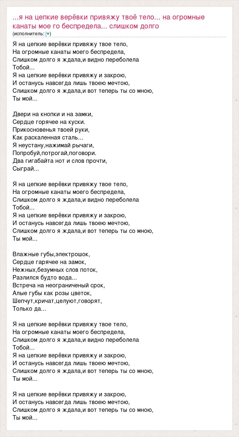 Я на цепкие верёвки привяжу твое тело, На огромные канаты моего беспредела, Слишком долго я ждала,и видно переболела Тобой... Я на цепкие верёвки привяжу и закрою, И останусь навсегда лишь твоею мечтою, Слишком долго я ждала,и вот теперь ты со мною, Ты мой... Двери на кнопки и на замки, Сердце горячее на куски. Прикосновенья твоей руки, Как раскаленная сталь... Я неустану,нажимай рычаги, Попробуй,потрогай,поговори. Два гигабайта нот и слов прочти, Сыграй... Я на цепкие верёвки привяжу твое тело, На огромные канаты моего беспредела, Слишком долго я ждала,и видно переболела Тобой... Я на цепкие верёвки привяжу и закрою, И останусь навсегда лишь твоею мечтою, Слишком долго я ждала,и вот теперь ты со мною, Ты мой... Влажные губы,электрошок, Сердце гарячее на замок, Нежных,безумных слов поток, Разлился будто вода... Встреча на неограниченый срок, Алые губы как розы цветок, Шепчут,кричат,целуют,говорят, Только да... Я на цепкие верёвки привяжу твое тело, На огромные канаты моего беспредела, Слишком долго я ждала,и видно переболела Тобой... Я на цепкие верёвки привяжу и закрою, И останусь навсегда лишь твоею мечтою, Слишком долго я ждала,и вот теперь ты со мною, Ты мой... Я на цепкие верёвки привяжу и закрою, И останусь навсегда лишь твоею мечтою, Слишком долго я ждала,и вот теперь ты со мною, Ты мой...