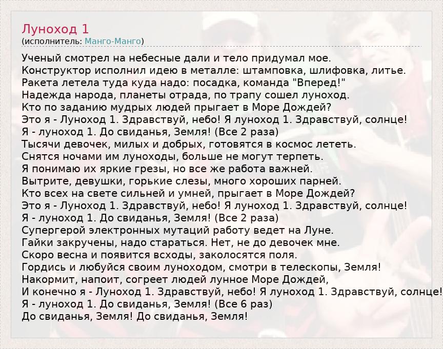 Ученый смотрел на небесные дали и тело придумал мое. Конструктор исполнил идею в металле: штамповка, шлифовка, литье. Ракета летела туда куда надо: посадка, команда "Вперед!" Надежда народа, планеты отрада, по трапу сошел луноход. Кто по заданию мудрых людей прыгает в Море Дождей? Это я - Луноход 1. Здравствуй, небо! Я луноход 1. Здравствуй, солнце! Я - луноход 1. До свиданья, Земля! (Все 2 раза) Тысячи девочек, милых и добрых, готовятся в космос лететь. Снятся ночами им луноходы, больше не могут терпеть. Я понимаю их яркие грезы, но все же работа важней. Вытрите, девушки, горькие слезы, много хороших парней. Кто всех на свете сильней и умней, прыгает в Море Дождей? Это я - Луноход 1. Здравствуй, небо! Я луноход 1. Здравствуй, солнце! Я - луноход 1. До свиданья, Земля! (Все 2 раза) Супергерой электронных мутаций работу ведет на Луне. Гайки закручены, надо стараться. Нет, не до девочек мне. Скоро весна и появится всходы, заколосятся поля. Гордись и любуйся своим луноходом, смотри в телескопы, Земля! Накормит, напоит, согреет людей лунное Море Дождей, И конечно я - Луноход 1. Здравствуй, небо! Я луноход 1. Здравствуй, солнце! Я - луноход 1. До свиданья, Земля! (Все 6 раз) До свиданья, Земля! До свиданья, Земля!