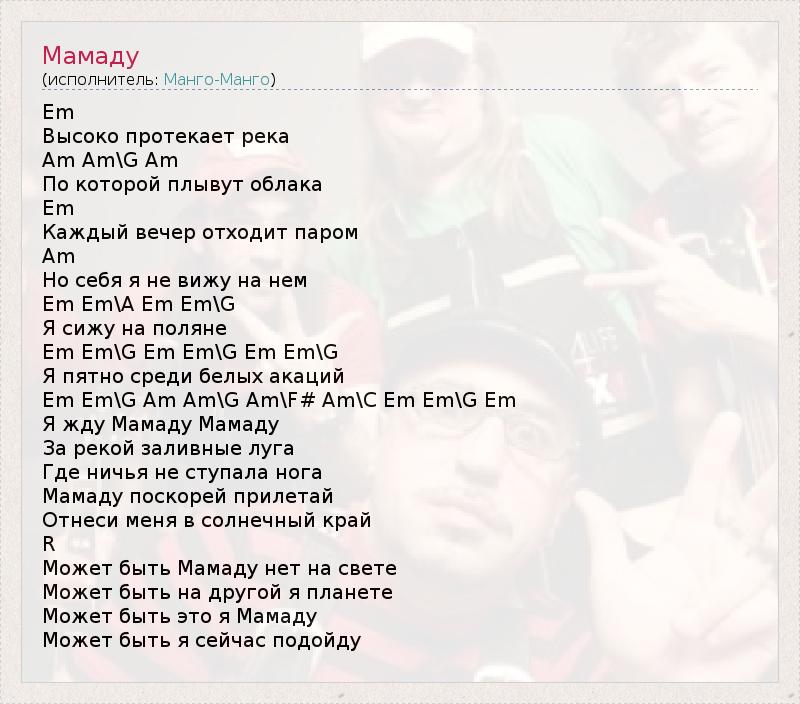 Em Высоко протекает река Am Am\G Am По которой плывут облака Em Каждый вечер отходит паром Am Но себя я не вижу на нем Em Em\A Em Em\G Я сижу на поляне Em Em\G Em Em\G Em Em\G Я пятно среди белых акаций Em Em\G Am Am\G Am\F# Am\C Em Em\G Em Я жду Мамаду Мамаду За рекой заливные луга Где ничья не ступала нога Мамаду поскорей прилетай Отнеси меня в солнечный край R Может быть Мамаду нет на свете Может быть на другой я планете Может быть это я Мамаду Может быть я сейчас подойду
