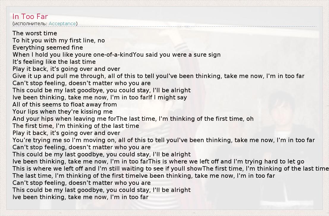 The worst time To hit you with my first line, no Everything seemed fine When I hold you like youre one-of-a-kindYou said you were a sure sign It's feeling like the last time Play it back, it's going over and over Give it up and pull me through, all of this to tell youI've been thinking, take me now, I'm in too far Can't stop feeling, doesn't matter who you are This could be my last goodbye, you could stay, I'll be alright Ive been thinking, take me now, I'm in too farIf I might say All of this seems to float away from Your lips when they're kissing me And your hips when leaving me forThe last time, I'm thinking of the first time, oh The first time, I'm thinking of the last time Play it back, it's going over and over You're trying me so I'm moving on, all of this to tell youI've been thinking, take me now, I'm in too far Can't stop feeling, doesn't matter who you are This could be my last goodbye, you could stay, I'll be alright Ive been thinking, take me now, I'm in too farThis is where we left off and I'm trying hard to let go This is where we left off and I'm still waiting to see if youll showThe first time, I'm thinking of the last time The last time, I'm thinking of the first timeIve been thinking, take me now, I'm in too far Can't stop feeling, doesn't matter who you are This could be my last goodbye, you could stay, I'll be alright Ive been thinking, take me now, I'm in too far