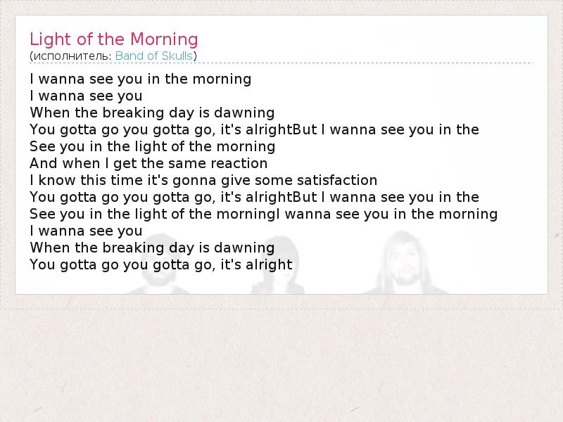I wanna see you in the morning I wanna see you When the breaking day is dawning You gotta go you gotta go, it's alrightBut I wanna see you in the See you in the light of the morning And when I get the same reaction I know this time it's gonna give some satisfaction You gotta go you gotta go, it's alrightBut I wanna see you in the See you in the light of the morningI wanna see you in the morning I wanna see you When the breaking day is dawning You gotta go you gotta go, it's alright