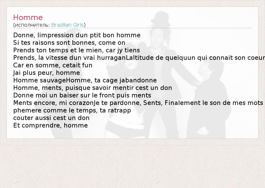 Это интересно:Вам когда-нибудь доводилось испытывать странное ощущение, будто вы находитесь в нескольких точках мира одновременно? Тринидад или Токио, Манхэттен или Милан, Бразилия или Багамы? Если нет, то Brazilian Girls подарят вам это чувство. Как говорит очаровательная вокалистка (единственная девушка в группе) Сабина, встреча с тремя другими участниками группы была похожа на "любовь с первого... продолжение