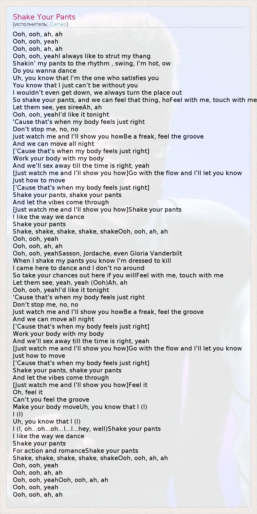 Ooh, ooh, ah, ah Ooh, ooh, yeah Ooh, ooh, ah, ah Ooh, ooh, yeahI always like to strut my thang Shakin' my pants to the rhythm , swing, I'm hot, ow Do you wanna dance Uh, you know that I'm the one who satisfies you You know that I just can't be without you I wouldn't even get down, we always turn the place out So shake your pants, and we can feel that thing, hoFeel with me, touch with me Let them see, yes sireeAh, ah Ooh, ooh, yeahI'd like it tonight 'Cause that's when my body feels just right Don't stop me, no, no Just watch me and I'll show you howBe a freak, feel the groove And we can move all night ['Cause that's when my body feels just right] Work your body with my body And we'll sex away till the time is right, yeah [Just watch me and I'll show you how]Go with the flow and I'll let you know Just how to move ['Cause that's when my body feels just right] Shake your pants, shake your pants And let the vibes come through [Just watch me and I'll show you how]Shake your pants I like the way we dance Shake your pants Shake, shake, shake, shake, shakeOoh, ooh, ah, ah Ooh, ooh, yeah Ooh, ooh, ah, ah Ooh, ooh, yeahSasson, Jordache, even Gloria Vanderbilt When I shake my pants you know I'm dressed to kill I came here to dance and I don't no around So take your chances out here if you willFeel with me, touch with me Let them see, yeah, yeah (Ooh)Ah, ah Ooh, ooh, yeahI'd like it tonight 'Cause that's when my body feels just right Don't stop me, no, no Just watch me and I'll show you howBe a freak, feel the groove And we can move all night ['Cause that's when my body feels just right] Work your body with my body And we'll sex away till the time is right, yeah [Just watch me and I'll show you how]Go with the flow and I'll let you know Just how to move ['Cause that's when my body feels just right] Shake your pants, shake your pants And let the vibes come through [Just watch me and I'll show you how]Feel it Oh, feel it Can't you feel the groove Make your body moveUh, you know that I (I) I (I) Uh, you know that I (I) I (I, oh...oh...oh...I...I...hey, well)Shake your pants I like the way we dance Shake your pants For action and romanceShake your pants Shake, shake, shake, shake, shakeOoh, ooh, ah, ah Ooh, ooh, yeah Ooh, ooh, ah, ah Ooh, ooh, yeahOoh, ooh, ah, ah Ooh, ooh, yeah Ooh, ooh, ah, ah