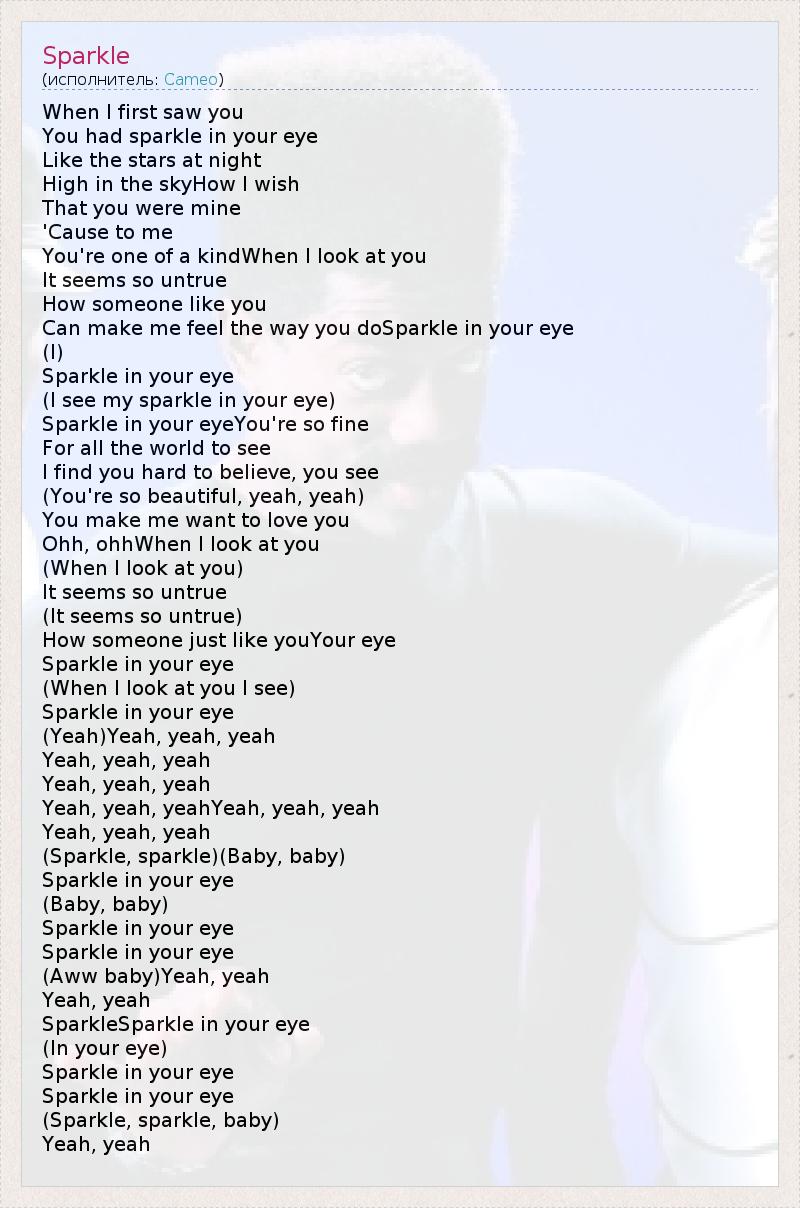 When I first saw you You had sparkle in your eye Like the stars at night High in the skyHow I wish That you were mine 'Cause to me You're one of a kindWhen I look at you It seems so untrue How someone like you Can make me feel the way you doSparkle in your eye (I) Sparkle in your eye (I see my sparkle in your eye) Sparkle in your eyeYou're so fine For all the world to see I find you hard to believe, you see (You're so beautiful, yeah, yeah) You make me want to love you Ohh, ohhWhen I look at you (When I look at you) It seems so untrue (It seems so untrue) How someone just like youYour eye Sparkle in your eye (When I look at you I see) Sparkle in your eye (Yeah)Yeah, yeah, yeah Yeah, yeah, yeah Yeah, yeah, yeah Yeah, yeah, yeahYeah, yeah, yeah Yeah, yeah, yeah (Sparkle, sparkle)(Baby, baby) Sparkle in your eye (Baby, baby) Sparkle in your eye Sparkle in your eye (Aww baby)Yeah, yeah Yeah, yeah SparkleSparkle in your eye (In your eye) Sparkle in your eye Sparkle in your eye (Sparkle, sparkle, baby) Yeah, yeah