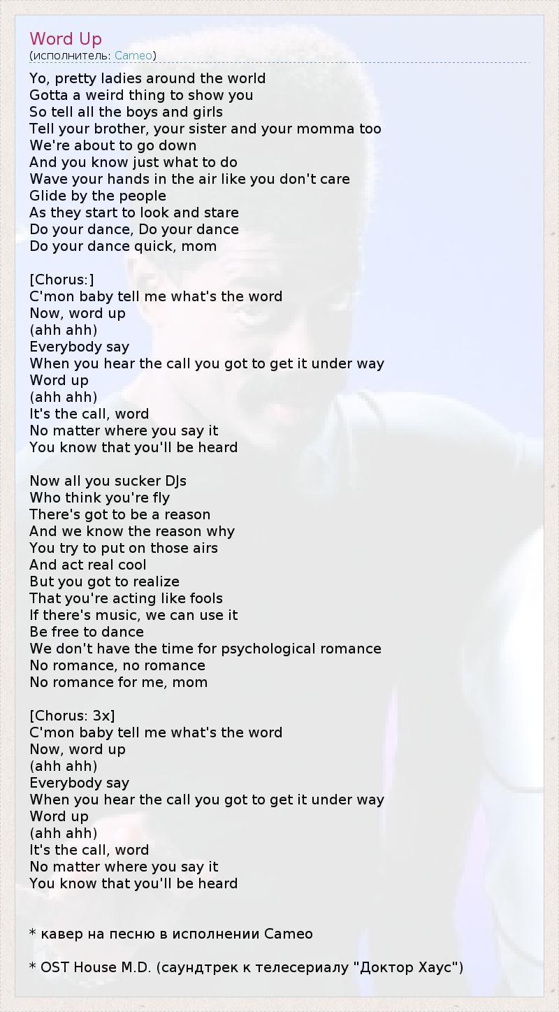 Это интересно:Группа была сформирована Нью-йоркским любителем клубной жизни Larry Blackmon в 1974 году. В то время она состояла из 13 человек, и называлась New York City Players. Вскоре они подписали контракт с Casablanka Records и переименовались в Cameo в 1976. Cameo начинали с глубокого фанкового грува, но было видно, что их место на танцполе. Уже в их первых альбомах “Cardiac Arrest”, “Ugly Ego”, “We All Know Who We Are” и “Secret Omen” было много танцевальных... продолжение