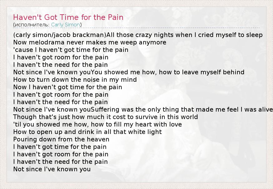 А как ты думаешь, о чем песня "Haven't Got Time for the Pain" ?