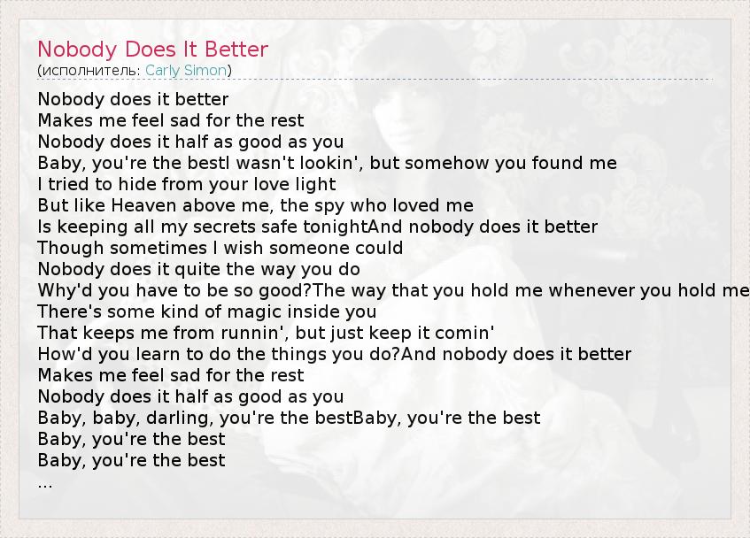 А как ты думаешь, о чем песня "Nobody Does It Better" ?