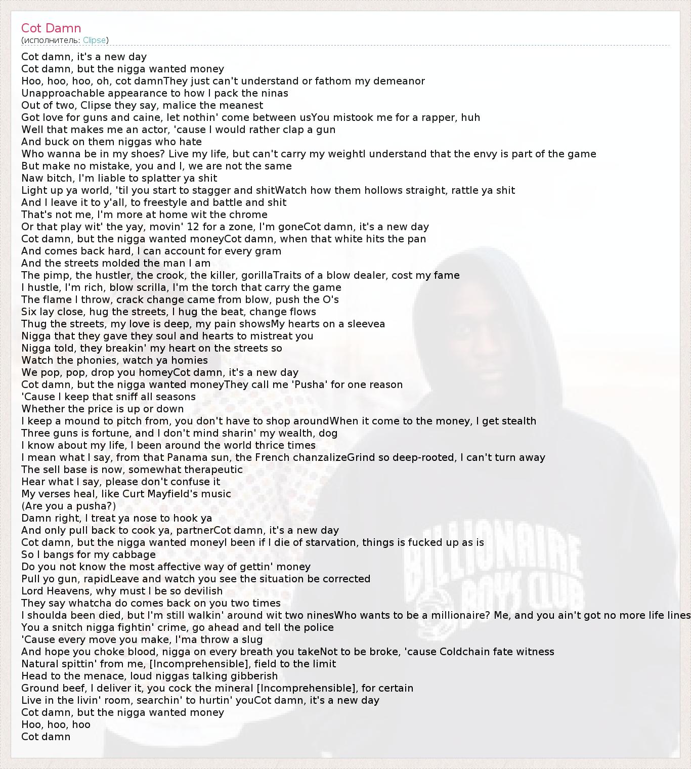 Cot damn, it's a new day Cot damn, but the nigga wanted money Hoo, hoo, hoo, oh, cot damnThey just can't understand or fathom my demeanor Unapproachable appearance to how I pack the ninas Out of two, Clipse they say, malice the meanest Got love for guns and caine, let nothin' come between usYou mistook me for a rapper, huh Well that makes me an actor, 'cause I would rather clap a gun And buck on them niggas who hate Who wanna be in my shoes? Live my life, but can't carry my weightI understand that the envy is part of the game But make no mistake, you and I, we are not the same Naw bitch, I'm liable to splatter ya shit Light up ya world, 'til you start to stagger and shitWatch how them hollows straight, rattle ya shit And I leave it to y'all, to freestyle and battle and shit That's not me, I'm more at home wit the chrome Or that play wit' the yay, movin' 12 for a zone, I'm goneCot damn, it's a new day Cot damn, but the nigga wanted moneyCot damn, when that white hits the pan And comes back hard, I can account for every gram And the streets molded the man I am The pimp, the hustler, the crook, the killer, gorillaTraits of a blow dealer, cost my fame I hustle, I'm rich, blow scrilla, I'm the torch that carry the game The flame I throw, crack change came from blow, push the O's Six lay close, hug the streets, I hug the beat, change flows Thug the streets, my love is deep, my pain showsMy hearts on a sleevea Nigga that they gave they soul and hearts to mistreat you Nigga told, they breakin' my heart on the streets so Watch the phonies, watch ya homies We pop, pop, drop you homeyCot damn, it's a new day Cot damn, but the nigga wanted moneyThey call me 'Pusha' for one reason 'Cause I keep that sniff all seasons Whether the price is up or down I keep a mound to pitch from, you don't have to shop aroundWhen it come to the money, I get stealth Three guns is fortune, and I don't mind sharin' my wealth, dog I know about my life, I been around the world thrice times I mean what I say, from that Panama sun, the French chanzalizeGrind so deep-rooted, I can't turn away The sell base is now, somewhat therapeutic Hear what I say, please don't confuse it My verses heal, like Curt Mayfield's music (Are you a pusha?) Damn right, I treat ya nose to hook ya And only pull back to cook ya, partnerCot damn, it's a new day Cot damn, but the nigga wanted moneyI been if I die of starvation, things is fucked up as is So I bangs for my cabbage Do you not know the most affective way of gettin' money Pull yo gun, rapidLeave and watch you see the situation be corrected Lord Heavens, why must I be so devilish They say whatcha do comes back on you two times I shoulda been died, but I'm still walkin' around wit two ninesWho wants to be a millionaire? Me, and you ain't got no more life lines You a snitch nigga fightin' crime, go ahead and tell the police 'Cause every move you make, I'ma throw a slug And hope you choke blood, nigga on every breath you takeNot to be broke, 'cause Coldchain fate witness Natural spittin' from me, [Incomprehensible], field to the limit Head to the menace, loud niggas talking gibberish Ground beef, I deliver it, you cock the mineral [Incomprehensible], for certain Live in the livin' room, searchin' to hurtin' youCot damn, it's a new day Cot damn, but the nigga wanted money Hoo, hoo, hoo Cot damn