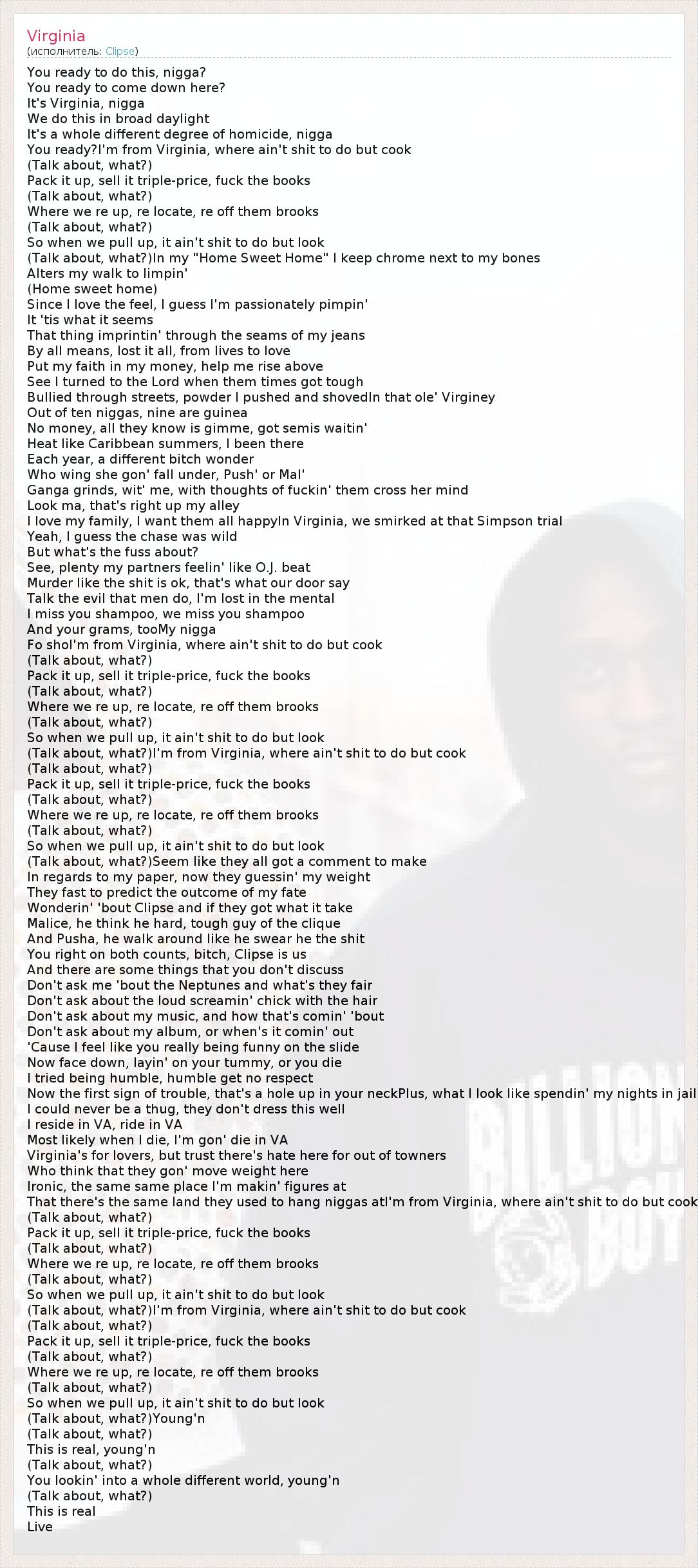 Это интересно:Clipse – выходцы из Бронкса. В их музыке нет ничего от Нью-Йорка и тем невероятнее звучит их происхождение. Братья Джин и Терренс Торнтоны (Malice и Pusha-T) перебрались в Вирджиния Бич, город на Атлантическом побережье, где взяли начало карьеры таких людей как Timbaland и The Neptunes.По словам Malice, сначала они собирались назваться Full Eclipse, "полное... продолжение