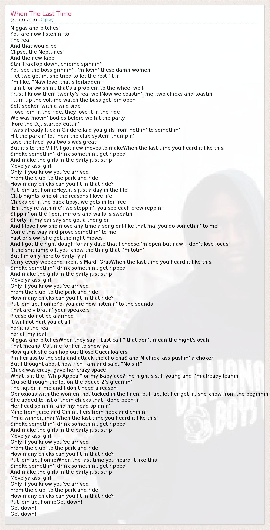Niggas and bitches You are now listenin' to The real And that would be Clipse, the Neptunes And the new label Star TrakTop down, chrome spinnin' You see the boss grinnin', I'm lovin' these damn women I let two get in, she tried to let the rest fit in I'm like, "Naw love, that's forbidden" I ain't for swishin', that's a problem to the wheel well Trust I know them twenty's real wellNow we coastin', me, two chicks and toastin' I turn up the volume watch the bass get 'em open Soft spoken with a wild side I love 'em in the ride, they love it in the ride We was movin' bodies before we hit the party 'Fore the D.J. started cuttin' I was already fuckin'Cinderella'd you girls from nothin' to somethin' Hit the parkin' lot, hear the club system thumpin' Lose the face, you two's was great But it's to the V.I.P, I got new moves to makeWhen the last time you heard it like this Smoke somethin', drink somethin', get ripped And make the girls in the party just strip Move ya ass, girl Only if you know you've arrived From the club, to the park and ride How many chicks can you fit in that ride? Put 'em up, homieHey, it's just a day in the life Club nights, one of the reasons I love life Chicks be in the back tipsy, we gets in for free 'Eh, they're with me'Two steppin', you see each crew reppin' Slippin' on the floor, mirrors and walls is sweatin' Shorty in my ear say she got a thong on And I love how she move any time a song onI like that ma, you do somethin' to me Come this way and prove somethin' to me Fast or slow, she got the right moves And I got the right dough for any date that I chooseI'm open but naw, I don't lose focus If the shit jump off, you know the thing that I'm totin' But I'm only here to party, y'all Carry every weekend like it's Mardi GrasWhen the last time you heard it like this Smoke somethin', drink somethin', get ripped And make the girls in the party just strip Move ya ass, girl Only if you know you've arrived From the club, to the park and ride How many chicks can you fit in that ride? Put 'em up, homieYo, you are now listenin' to the sounds That are vibratin' your speakers Please do not be alarmed It will not hurt you at all For it is the real For all my real Niggas and bitchesWhen they say, "Last call," that don't mean the night's ovah That means it's time for her to show ya How quick she can hop out those Gucci loafers Pin her ass to the sofa and attack the cho chaS and M chick, ass pushin' a choker But I thought about how rich I am and said, "No sir!" Chick was crazy, gave her crazy space What is it the "Whip Appeal" or my Babyface?The night's still young and I'm already leanin' Cruise through the lot on the deuce-2's gleamin' The liquor in me and I don't need a reason Obnoxious with the women, hot tucked in the linenI pull up, let her get in, she know from the beginnin' She added to list of them chicks that I done been in Her head spinnin' and my head spinnin' Mine from juice and Ginin', hers from neck and chinin' I'm a winner, manWhen the last time you heard it like this Smoke somethin', drink somethin', get ripped And make the girls in the party just strip Move ya ass, girl Only if you know you've arrived From the club, to the park and ride How many chicks can you fit in that ride? Put 'em up, homieWhen the last time you heard it like this Smoke somethin', drink somethin', get ripped And make the girls in the party just strip Move ya ass, girl Only if you know you've arrived From the club, to the park and ride How many chicks can you fit in that ride? Put 'em up, homieGet down! Get down! Get down!