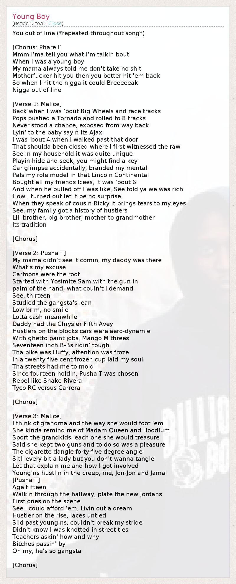 You out of line (*repeated throughout song*) [Chorus: Pharell] Mmm I'ma tell you what I'm talkin bout When I was a young boy My mama always told me don't take no shit Motherfucker hit you then you better hit 'em back So when I hit the nigga it could Breeeeeak Nigga out of line [Verse 1: Malice] Back when I was 'bout Big Wheels and race tracks Pops pushed a Tornado and rolled to 8 tracks Never stood a chance, exposed from way back Lyin' to the baby sayin its Ajax I was 'bout 4 when I walked past that door That shoulda been closed where I first witnessed the raw See in my household it was quite unique Playin hide and seek, you might find a key Car glimpse accidentally, branded my mental Pals my role model in that Lincoln Continental Bought all my friends Icees, it was 'bout 6 And when he pulled off I was like, See told ya we was rich How I turned out let it be no surprise When they speak of cousin Ricky it brings tears to my eyes See, my family got a history of hustlers Lil' brother, big brother, mother to grandmother Its tradition [Chorus] [Verse 2: Pusha T] My mama didn't see it comin, my daddy was there What's my excuse Cartoons were the root Started with Yosimite Sam with the gun in palm of the hand, what couln't I demand See, thirteen Studied the gangsta's lean Low brim, no smile Lotta cash meanwhile Daddy had the Chrysler Fifth Avey Hustlers on the blocks cars were aero-dynamie With ghetto paint jobs, Mango M threes Seventeen inch B-Bs ridin' tough Tha bike was Huffy, attention was froze In a twenty five cent frozen cup laid my soul Tha streets had me to mold Since fourteen holdin, Pusha T was chosen Rebel like Shake Rivera Tyco RC versus Carrera [Chorus] [Verse 3: Malice] I think of grandma and the way she would foot 'em She kinda remind me of Madam Queen and Hoodlum Sport the grandkids, each one she would treasure Said she kept two guns and to do so was a pleasure The cigarette dangle forty-five degree angle Sitll every bit a lady but you don't wanna tangle Let that explain me and how I got involved Young'ns hustlin in the creep, me, Jon-Jon and Jamal [Pusha T] Age Fifteen Walkin through the hallway, plate the new Jordans First ones on the scene See I could afford 'em, Livin out a dream Hustler on the rise, laces untied Slid past young'ns, couldn't break my stride Didn't know I was knotted in street ties Teachers askin' how and why Bitches passin' by Oh my, he's so gangsta [Chorus]