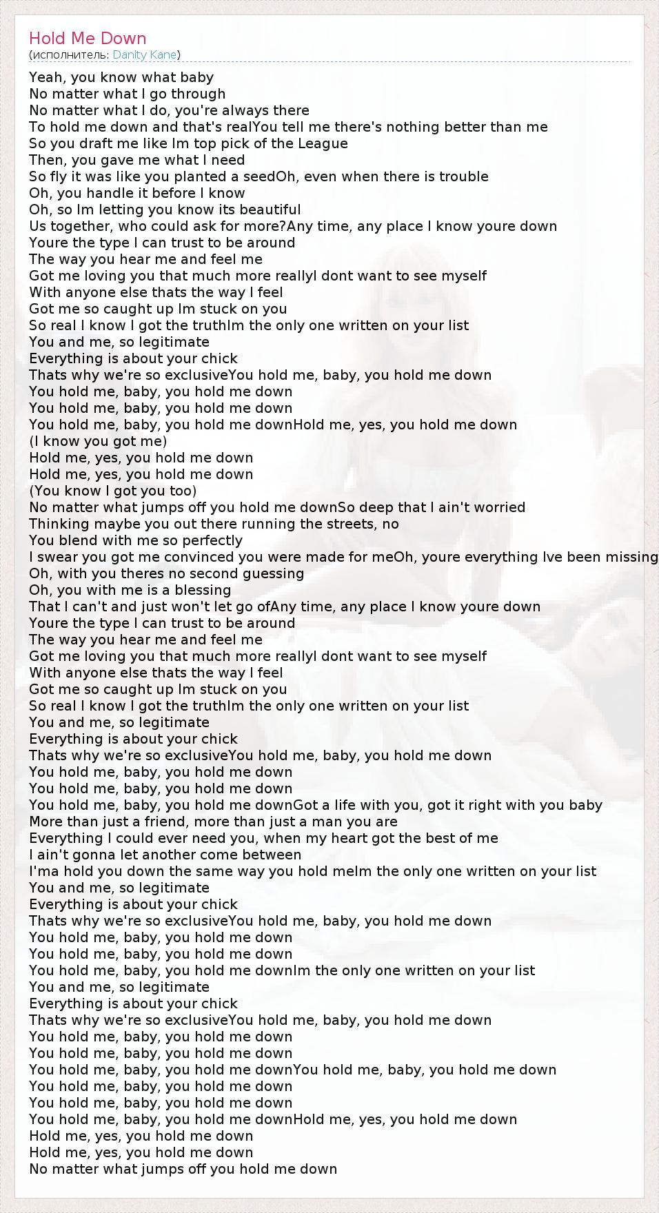 Yeah, you know what baby No matter what I go through No matter what I do, you're always there To hold me down and that's realYou tell me there's nothing better than me So you draft me like Im top pick of the League Then, you gave me what I need So fly it was like you planted a seedOh, even when there is trouble Oh, you handle it before I know Oh, so Im letting you know its beautiful Us together, who could ask for more?Any time, any place I know youre down Youre the type I can trust to be around The way you hear me and feel me Got me loving you that much more reallyI dont want to see myself With anyone else thats the way I feel Got me so caught up Im stuck on you So real I know I got the truthIm the only one written on your list You and me, so legitimate Everything is about your chick Thats why we're so exclusiveYou hold me, baby, you hold me down You hold me, baby, you hold me down You hold me, baby, you hold me down You hold me, baby, you hold me downHold me, yes, you hold me down (I know you got me) Hold me, yes, you hold me down Hold me, yes, you hold me down (You know I got you too) No matter what jumps off you hold me downSo deep that I ain't worried Thinking maybe you out there running the streets, no You blend with me so perfectly I swear you got me convinced you were made for meOh, youre everything Ive been missing Oh, with you theres no second guessing Oh, you with me is a blessing That I can't and just won't let go ofAny time, any place I know youre down Youre the type I can trust to be around The way you hear me and feel me Got me loving you that much more reallyI dont want to see myself With anyone else thats the way I feel Got me so caught up Im stuck on you So real I know I got the truthIm the only one written on your list You and me, so legitimate Everything is about your chick Thats why we're so exclusiveYou hold me, baby, you hold me down You hold me, baby, you hold me down You hold me, baby, you hold me down You hold me, baby, you hold me downGot a life with you, got it right with you baby More than just a friend, more than just a man you are Everything I could ever need you, when my heart got the best of me I ain't gonna let another come between I'ma hold you down the same way you hold meIm the only one written on your list You and me, so legitimate Everything is about your chick Thats why we're so exclusiveYou hold me, baby, you hold me down You hold me, baby, you hold me down You hold me, baby, you hold me down You hold me, baby, you hold me downIm the only one written on your list You and me, so legitimate Everything is about your chick Thats why we're so exclusiveYou hold me, baby, you hold me down You hold me, baby, you hold me down You hold me, baby, you hold me down You hold me, baby, you hold me downYou hold me, baby, you hold me down You hold me, baby, you hold me down You hold me, baby, you hold me down You hold me, baby, you hold me downHold me, yes, you hold me down Hold me, yes, you hold me down Hold me, yes, you hold me down No matter what jumps off you hold me down