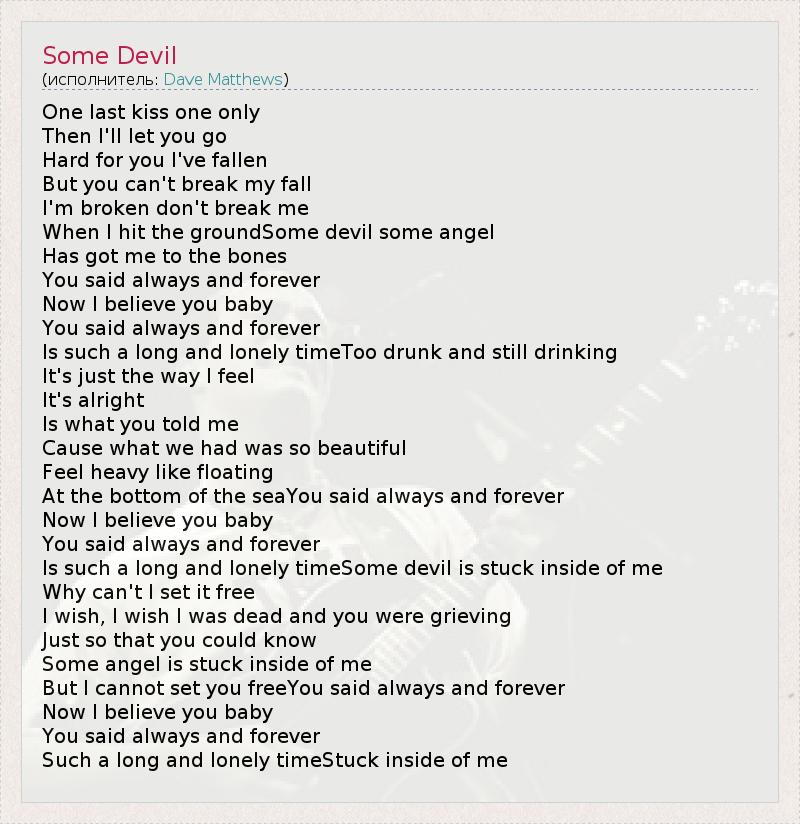 One last kiss one only Then I'll let you go Hard for you I've fallen But you can't break my fall I'm broken don't break me When I hit the groundSome devil some angel Has got me to the bones You said always and forever Now I believe you baby You said always and forever Is such a long and lonely timeToo drunk and still drinking It's just the way I feel It's alright Is what you told me Cause what we had was so beautiful Feel heavy like floating At the bottom of the seaYou said always and forever Now I believe you baby You said always and forever Is such a long and lonely timeSome devil is stuck inside of me Why can't I set it free I wish, I wish I was dead and you were grieving Just so that you could know Some angel is stuck inside of me But I cannot set you freeYou said always and forever Now I believe you baby You said always and forever Such a long and lonely timeStuck inside of me