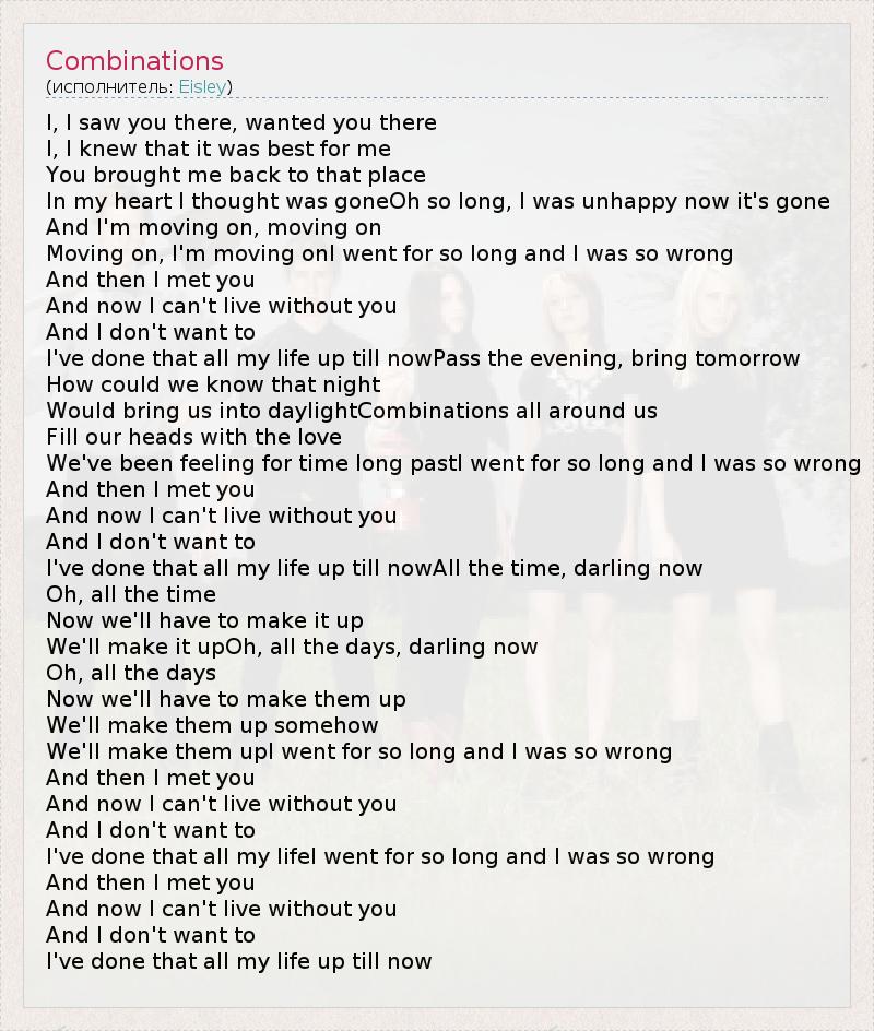 I, I saw you there, wanted you there I, I knew that it was best for me You brought me back to that place In my heart I thought was goneOh so long, I was unhappy now it's gone And I'm moving on, moving on Moving on, I'm moving onI went for so long and I was so wrong And then I met you And now I can't live without you And I don't want to I've done that all my life up till nowPass the evening, bring tomorrow How could we know that night Would bring us into daylightCombinations all around us Fill our heads with the love We've been feeling for time long pastI went for so long and I was so wrong And then I met you And now I can't live without you And I don't want to I've done that all my life up till nowAll the time, darling now Oh, all the time Now we'll have to make it up We'll make it upOh, all the days, darling now Oh, all the days Now we'll have to make them up We'll make them up somehow We'll make them upI went for so long and I was so wrong And then I met you And now I can't live without you And I don't want to I've done that all my lifeI went for so long and I was so wrong And then I met you And now I can't live without you And I don't want to I've done that all my life up till now