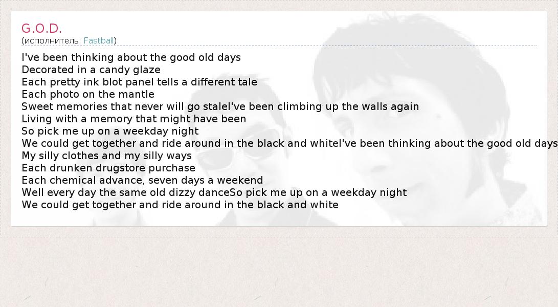 We could get together and ride around in the black and whiteI've been thinking about the good old days