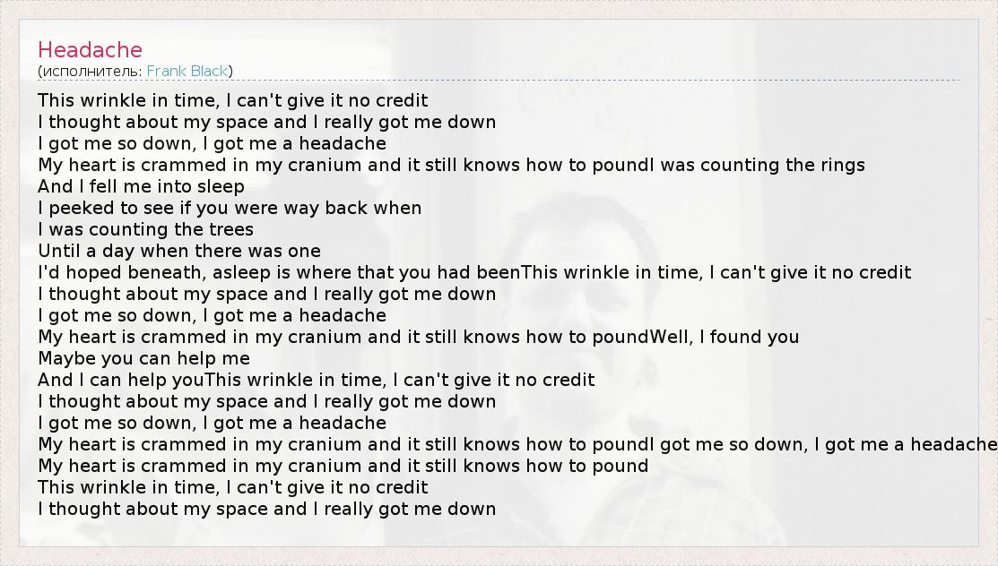 My heart is crammed in my cranium and it still knows how to poundI got me so down, I got me a headache