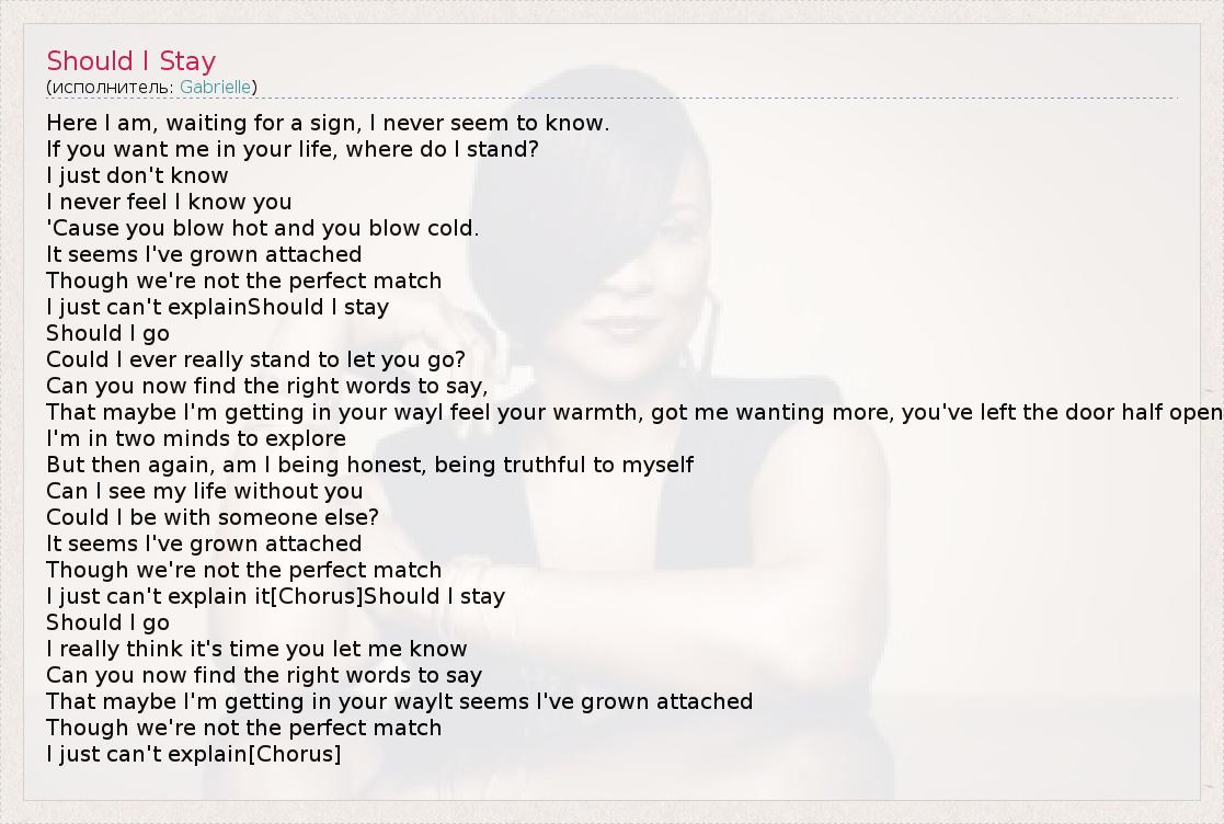 Here I am, waiting for a sign, I never seem to know. If you want me in your life, where do I stand? I just don't know I never feel I know you 'Cause you blow hot and you blow cold. It seems I've grown attached Though we're not the perfect match I just can't explainShould I stay Should I go Could I ever really stand to let you go? Can you now find the right words to say, That maybe I'm getting in your wayI feel your warmth, got me wanting more, you've left the door half open I'm in two minds to explore But then again, am I being honest, being truthful to myself Can I see my life without you Could I be with someone else? It seems I've grown attached Though we're not the perfect match I just can't explain it[Chorus]Should I stay Should I go I really think it's time you let me know Can you now find the right words to say That maybe I'm getting in your wayIt seems I've grown attached Though we're not the perfect match I just can't explain[Chorus]