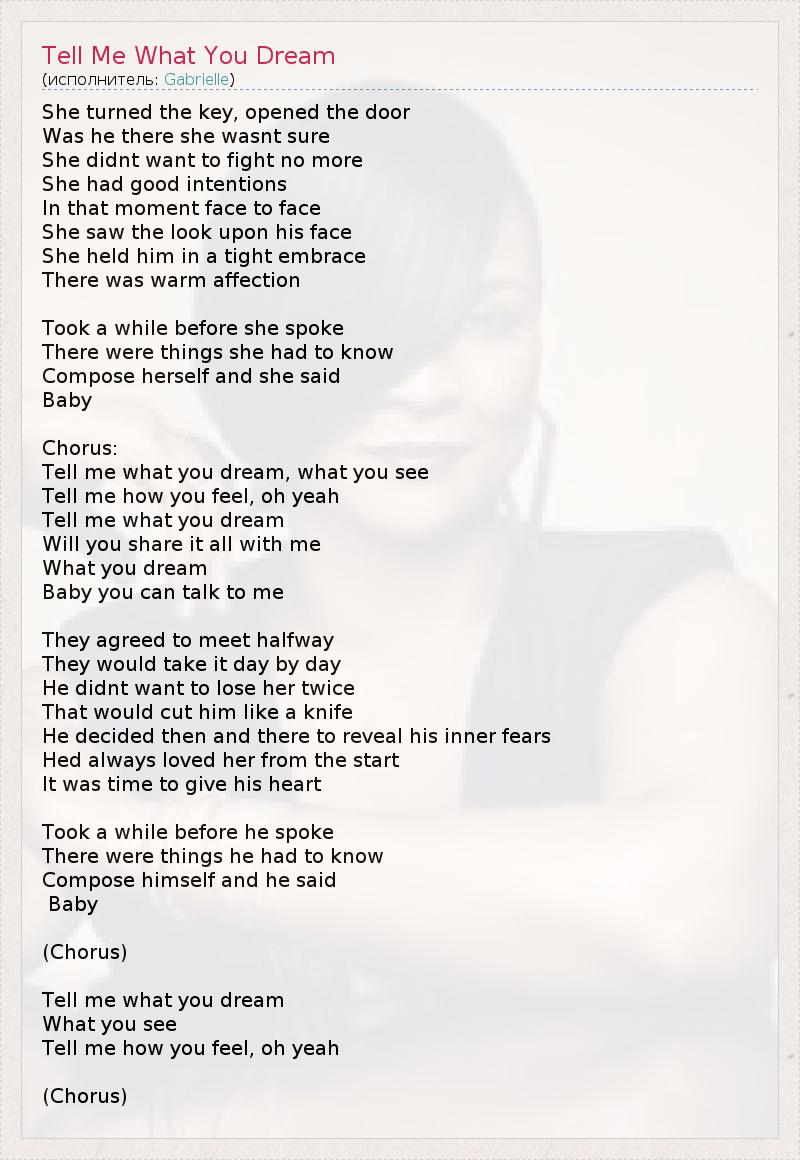 She turned the key, opened the door Was he there she wasnt sure She didnt want to fight no more She had good intentions In that moment face to face She saw the look upon his face She held him in a tight embrace There was warm affection Took a while before she spoke There were things she had to know Compose herself and she said Baby Chorus: Tell me what you dream, what you see Tell me how you feel, oh yeah Tell me what you dream Will you share it all with me What you dream Baby you can talk to me They agreed to meet halfway They would take it day by day He didnt want to lose her twice That would cut him like a knife He decided then and there to reveal his inner fears Hed always loved her from the start It was time to give his heart Took a while before he spoke There were things he had to know Compose himself and he said Baby (Chorus) Tell me what you dream What you see Tell me how you feel, oh yeah (Chorus)