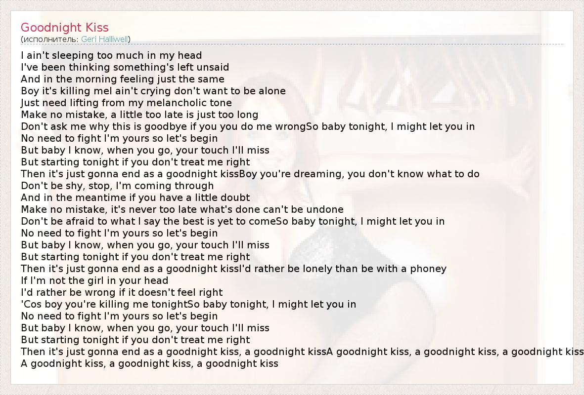 I ain't sleeping too much in my head I've been thinking something's left unsaid And in the morning feeling just the same Boy it's killing meI ain't crying don't want to be alone Just need lifting from my melancholic tone Make no mistake, a little too late is just too long Don't ask me why this is goodbye if you you do me wrongSo baby tonight, I might let you in No need to fight I'm yours so let's begin But baby I know, when you go, your touch I'll miss But starting tonight if you don't treat me right Then it's just gonna end as a goodnight kissBoy you're dreaming, you don't know what to do Don't be shy, stop, I'm coming through And in the meantime if you have a little doubt Make no mistake, it's never too late what's done can't be undone Don't be afraid to what I say the best is yet to comeSo baby tonight, I might let you in No need to fight I'm yours so let's begin But baby I know, when you go, your touch I'll miss But starting tonight if you don't treat me right Then it's just gonna end as a goodnight kissI'd rather be lonely than be with a phoney If I'm not the girl in your head I'd rather be wrong if it doesn't feel right 'Cos boy you're killing me tonightSo baby tonight, I might let you in No need to fight I'm yours so let's begin But baby I know, when you go, your touch I'll miss But starting tonight if you don't treat me right Then it's just gonna end as a goodnight kiss, a goodnight kissA goodnight kiss, a goodnight kiss, a goodnight kiss A goodnight kiss, a goodnight kiss, a goodnight kiss