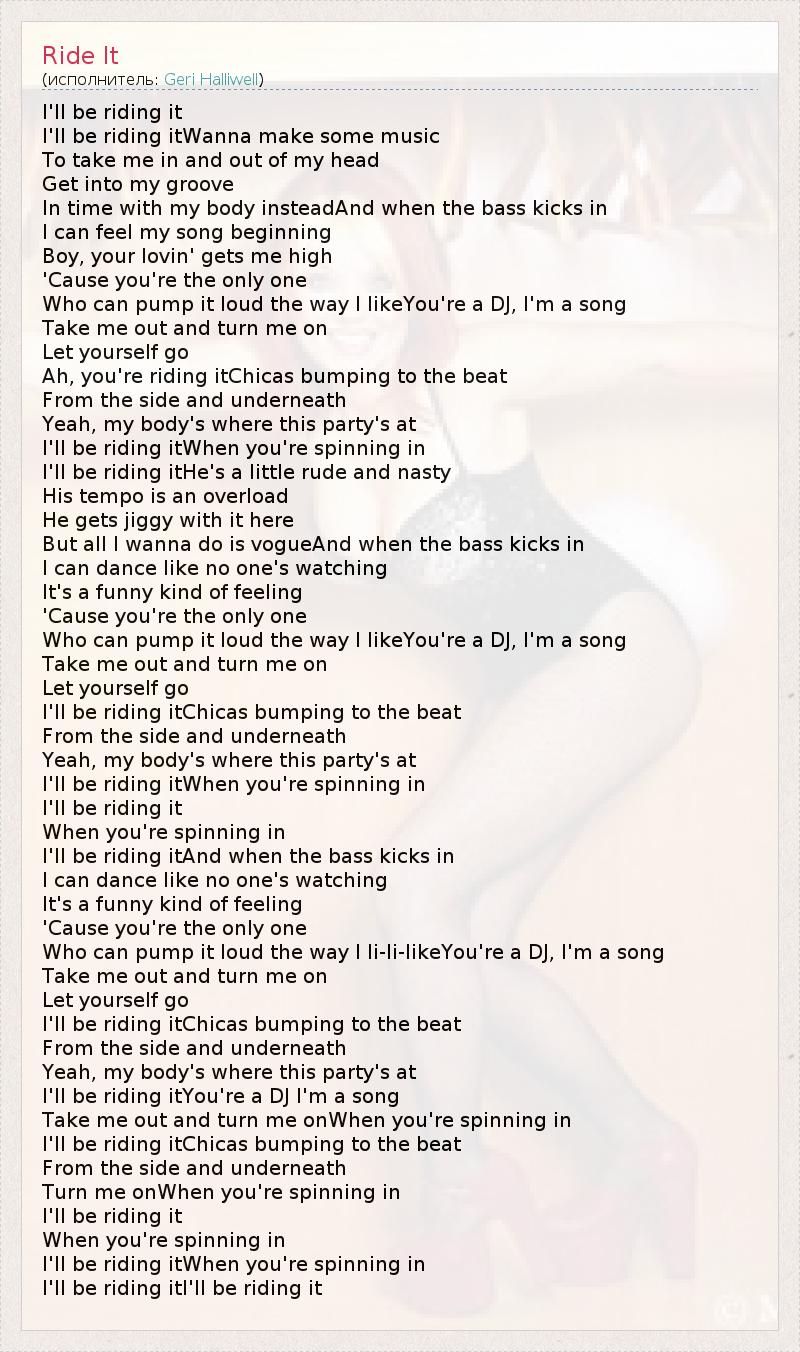 I'll be riding it I'll be riding itWanna make some music To take me in and out of my head Get into my groove In time with my body insteadAnd when the bass kicks in I can feel my song beginning Boy, your lovin' gets me high 'Cause you're the only one Who can pump it loud the way I likeYou're a DJ, I'm a song Take me out and turn me on Let yourself go Ah, you're riding itChicas bumping to the beat From the side and underneath Yeah, my body's where this party's at I'll be riding itWhen you're spinning in I'll be riding itHe's a little rude and nasty His tempo is an overload He gets jiggy with it here But all I wanna do is vogueAnd when the bass kicks in I can dance like no one's watching It's a funny kind of feeling 'Cause you're the only one Who can pump it loud the way I likeYou're a DJ, I'm a song Take me out and turn me on Let yourself go I'll be riding itChicas bumping to the beat From the side and underneath Yeah, my body's where this party's at I'll be riding itWhen you're spinning in I'll be riding it When you're spinning in I'll be riding itAnd when the bass kicks in I can dance like no one's watching It's a funny kind of feeling 'Cause you're the only one Who can pump it loud the way I li-li-likeYou're a DJ, I'm a song Take me out and turn me on Let yourself go I'll be riding itChicas bumping to the beat From the side and underneath Yeah, my body's where this party's at I'll be riding itYou're a DJ I'm a song Take me out and turn me onWhen you're spinning in I'll be riding itChicas bumping to the beat From the side and underneath Turn me onWhen you're spinning in I'll be riding it When you're spinning in I'll be riding itWhen you're spinning in I'll be riding itI'll be riding it