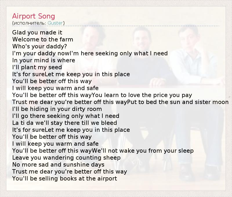 Это интересно:Guster - американская группа альтернативного рока, которая известна ее живыми концертами, юмором, и культом после. Группа сформирована Адамом Гарднером, Раяном Миллером, и Брайеном Розенуоркелем в 1991Группа осталась "подземной" для своих первых двух альбомов, "Parachute" (1994) и "Goldfly" (1997), но ворвалась в музыкальную индустрию в 1999 с ее третьим альбомом студии, "Lost and Gone Forever",... продолжение