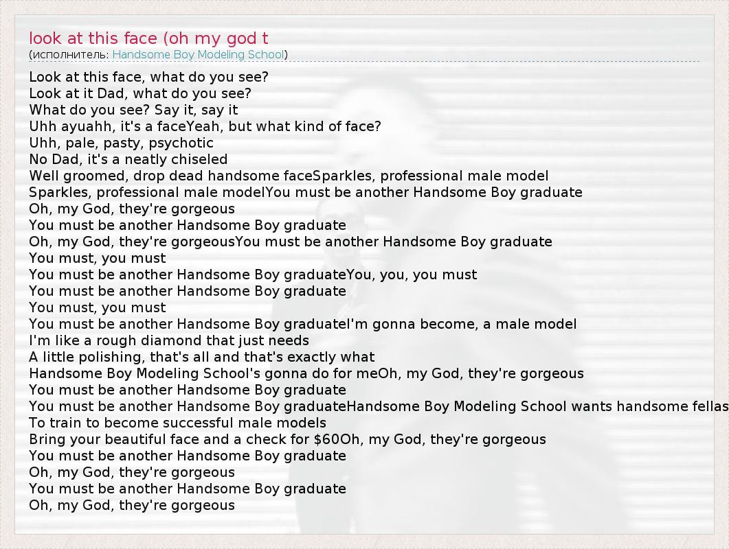 Look at this face, what do you see? Look at it Dad, what do you see? What do you see? Say it, say it Uhh ayuahh, it's a faceYeah, but what kind of face? Uhh, pale, pasty, psychotic No Dad, it's a neatly chiseled Well groomed, drop dead handsome faceSparkles, professional male model Sparkles, professional male modelYou must be another Handsome Boy graduate Oh, my God, they're gorgeous You must be another Handsome Boy graduate Oh, my God, they're gorgeousYou must be another Handsome Boy graduate You must, you must You must be another Handsome Boy graduateYou, you, you must You must be another Handsome Boy graduate You must, you must You must be another Handsome Boy graduateI'm gonna become, a male model I'm like a rough diamond that just needs A little polishing, that's all and that's exactly what Handsome Boy Modeling School's gonna do for meOh, my God, they're gorgeous You must be another Handsome Boy graduate You must be another Handsome Boy graduateHandsome Boy Modeling School wants handsome fellas To train to become successful male models Bring your beautiful face and a check for $60Oh, my God, they're gorgeous You must be another Handsome Boy graduate Oh, my God, they're gorgeous You must be another Handsome Boy graduate Oh, my God, they're gorgeous