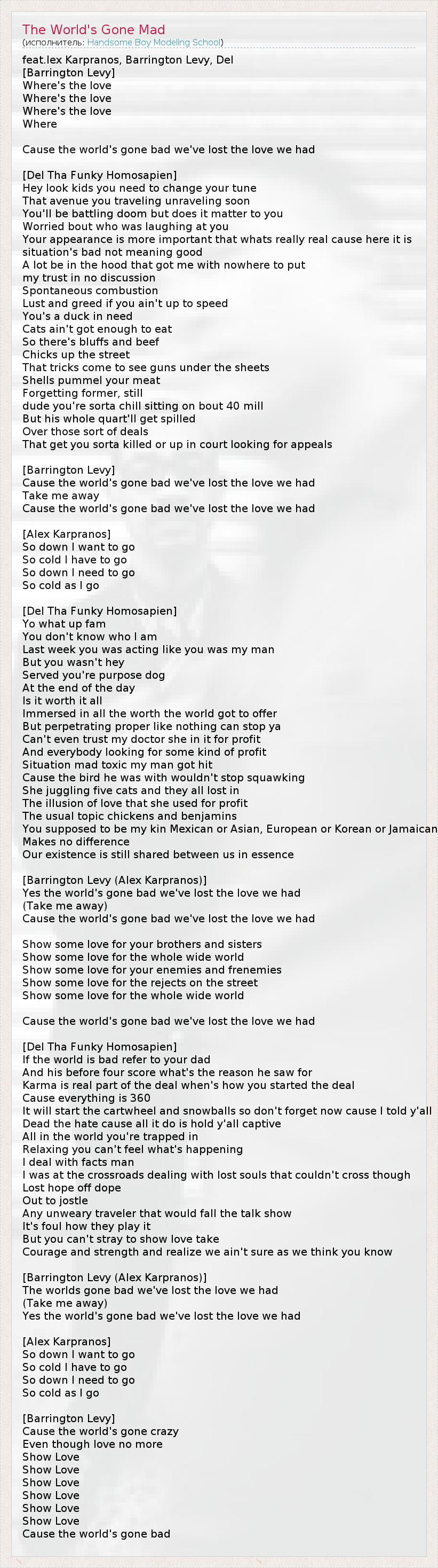 feat.lex Karpranos, Barrington Levy, Del [Barrington Levy] Where's the love Where's the love Where's the love Where Cause the world's gone bad we've lost the love we had [Del Tha Funky Homosapien] Hey look kids you need to change your tune That avenue you traveling unraveling soon You'll be battling doom but does it matter to you Worried bout who was laughing at you Your appearance is more important that whats really real cause here it is situation's bad not meaning good A lot be in the hood that got me with nowhere to put my trust in no discussion Spontaneous combustion Lust and greed if you ain't up to speed You's a duck in need Cats ain't got enough to eat So there's bluffs and beef Chicks up the street That tricks come to see guns under the sheets Shells pummel your meat Forgetting former, still dude you're sorta chill sitting on bout 40 mill But his whole quart'll get spilled Over those sort of deals That get you sorta killed or up in court looking for appeals [Barrington Levy] Cause the world's gone bad we've lost the love we had Take me away Cause the world's gone bad we've lost the love we had [Alex Karpranos] So down I want to go So cold I have to go So down I need to go So cold as I go [Del Tha Funky Homosapien] Yo what up fam You don't know who I am Last week you was acting like you was my man But you wasn't hey Served you're purpose dog At the end of the day Is it worth it all Immersed in all the worth the world got to offer But perpetrating proper like nothing can stop ya Can't even trust my doctor she in it for profit And everybody looking for some kind of profit Situation mad toxic my man got hit Cause the bird he was with wouldn't stop squawking She juggling five cats and they all lost in The illusion of love that she used for profit The usual topic chickens and benjamins You supposed to be my kin Mexican or Asian, European or Korean or Jamaican Makes no difference Our existence is still shared between us in essence [Barrington Levy (Alex Karpranos)] Yes the world's gone bad we've lost the love we had (Take me away) Cause the world's gone bad we've lost the love we had Show some love for your brothers and sisters Show some love for the whole wide world Show some love for your enemies and frenemies Show some love for the rejects on the street Show some love for the whole wide world Cause the world's gone bad we've lost the love we had [Del Tha Funky Homosapien] If the world is bad refer to your dad And his before four score what's the reason he saw for Karma is real part of the deal when's how you started the deal Cause everything is 360 It will start the cartwheel and snowballs so don't forget now cause I told y'all Dead the hate cause all it do is hold y'all captive All in the world you're trapped in Relaxing you can't feel what's happening I deal with facts man I was at the crossroads dealing with lost souls that couldn't cross though Lost hope off dope Out to jostle Any unweary traveler that would fall the talk show It's foul how they play it But you can't stray to show love take Courage and strength and realize we ain't sure as we think you know [Barrington Levy (Alex Karpranos)] The worlds gone bad we've lost the love we had (Take me away) Yes the world's gone bad we've lost the love we had [Alex Karpranos] So down I want to go So cold I have to go So down I need to go So cold as I go [Barrington Levy] Cause the world's gone crazy Even though love no more Show Love Show Love Show Love Show Love Show Love Show Love Cause the world's gone bad