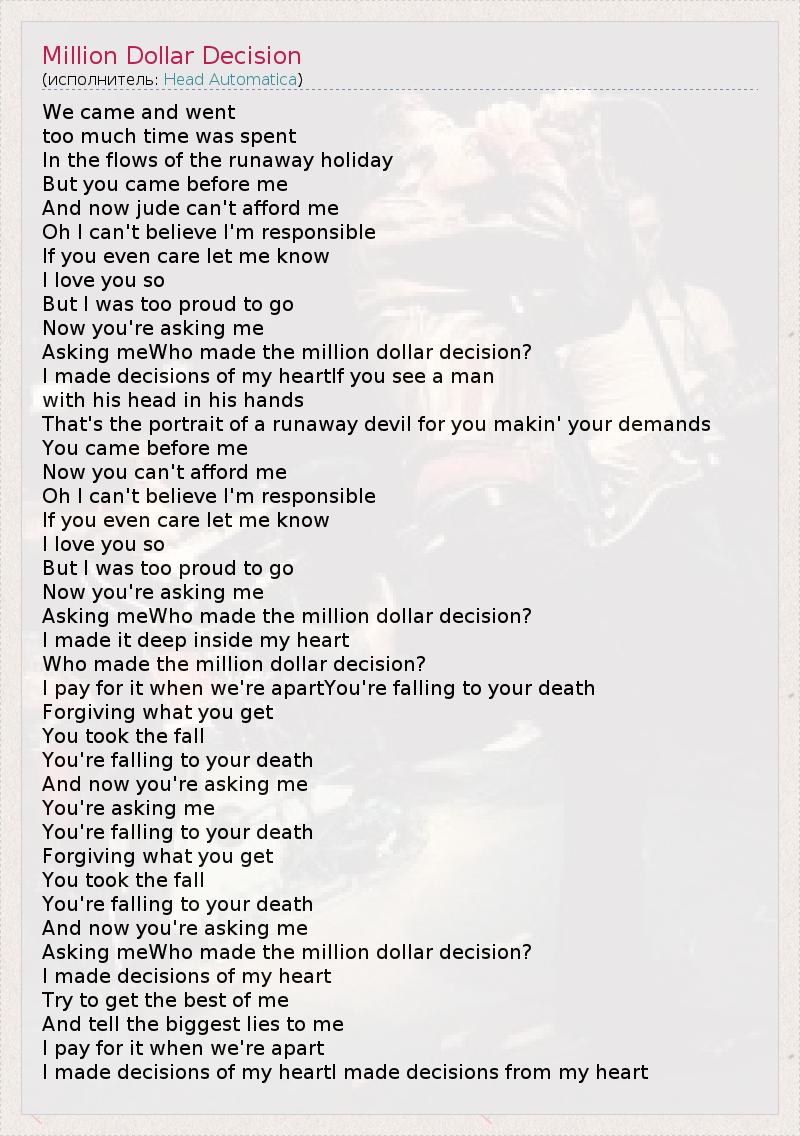 А как ты думаешь, о чем песня "Million Dollar Decision" ?