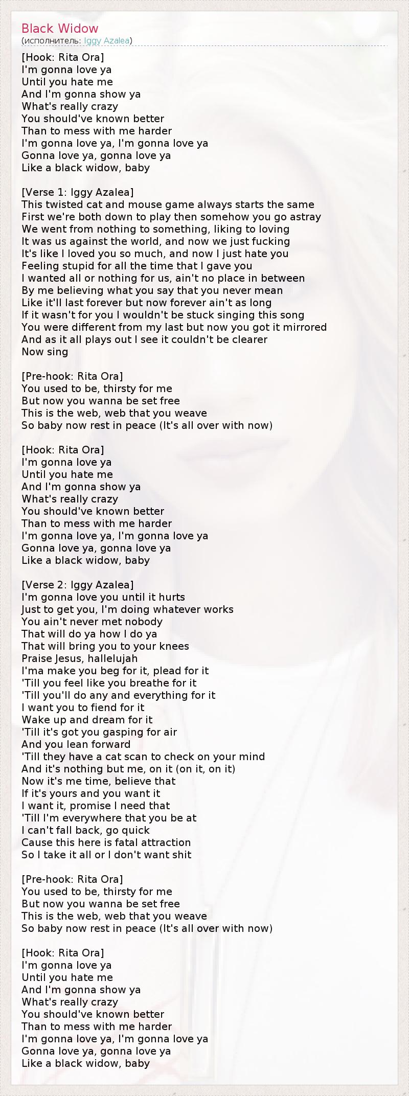Брат за брата(ost ПРИТЯЖЕНИЕ)  Я ГАТОВИЛА ЛИБИДУ ПОЛНАЯ ВЕРСИЯ (ЕСТЬ ТЕКСТ)  Cocaine (есть перевод текста)❤  La Gelosia (с текстом перевода)  Продолжение медитации на энергии  Доставляет!(текст)  Голуби. ...Там, там, высоко...  Виноград (Минус)  Weekend!(текст)  Порушка-Параня