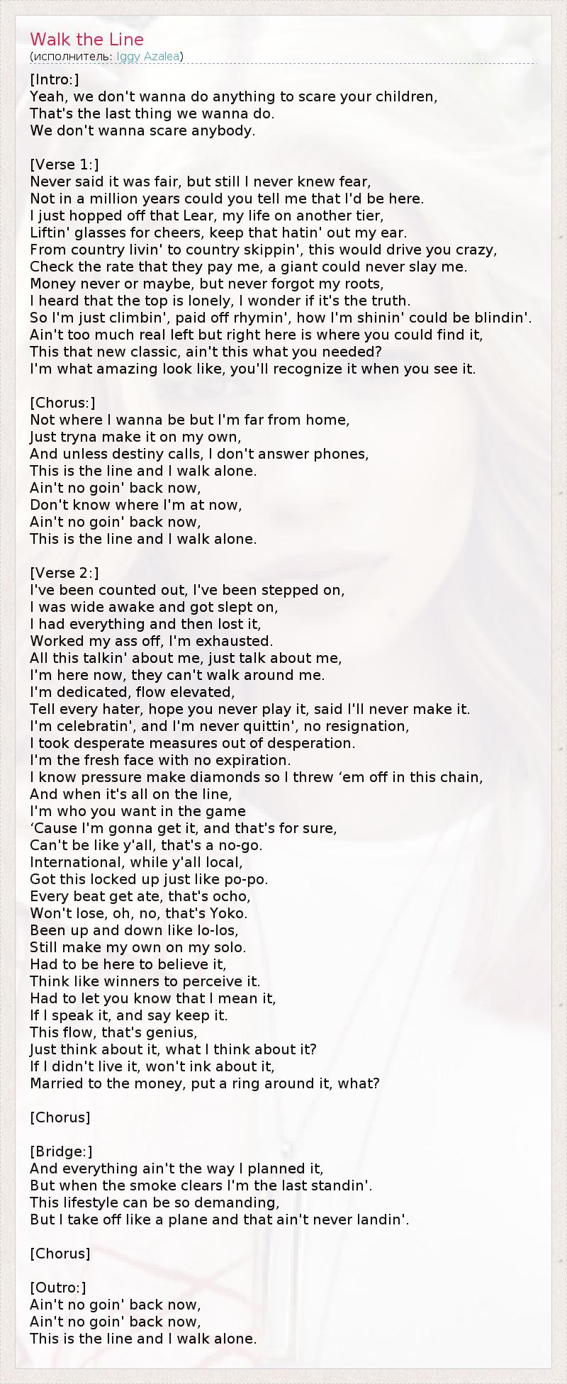 [Intro:] Yeah, we don't wanna do anything to scare your children, That's the last thing we wanna do. We don't wanna scare anybody. [Verse 1:] Never said it was fair, but still I never knew fear, Not in a million years could you tell me that I'd be here. I just hopped off that Lear, my life on another tier, Liftin' glasses for cheers, keep that hatin' out my ear. From country livin' to country skippin', this would drive you crazy, Check the rate that they pay me, a giant could never slay me. Money never or maybe, but never forgot my roots, I heard that the top is lonely, I wonder if it's the truth. So I'm just climbin', paid off rhymin', how I'm shinin' could be blindin'. Ain't too much real left but right here is where you could find it, This that new classic, ain't this what you needed? I'm what amazing look like, you'll recognize it when you see it. [Chorus:] Not where I wanna be but I'm far from home, Just tryna make it on my own, And unless destiny calls, I don't answer phones, This is the line and I walk alone. Ain't no goin' back now, Don't know where I'm at now, Ain't no goin' back now, This is the line and I walk alone. [Verse 2:] I've been counted out, I've been stepped on, I was wide awake and got slept on, I had everything and then lost it, Worked my ass off, I'm exhausted. All this talkin' about me, just talk about me, I'm here now, they can't walk around me. I'm dedicated, flow elevated, Tell every hater, hope you never play it, said I'll never make it. I'm celebratin', and I'm never quittin', no resignation, I took desperate measures out of desperation. I'm the fresh face with no expiration. I know pressure make diamonds so I threw ‘em off in this chain, And when it's all on the line, I'm who you want in the game ‘Cause I'm gonna get it, and that's for sure, Can't be like y'all, that's a no-go. International, while y'all local, Got this locked up just like po-po. Every beat get ate, that's ocho, Won't lose, oh, no, that's Yoko. Been up and down like lo-los, Still make my own on my solo. Had to be here to believe it, Think like winners to perceive it. Had to let you know that I mean it, If I speak it, and say keep it. This flow, that's genius, Just think about it, what I think about it? If I didn't live it, won't ink about it, Married to the money, put a ring around it, what? [Chorus] [Bridge:] And everything ain't the way I planned it, But when the smoke clears I'm the last standin'. This lifestyle can be so demanding, But I take off like a plane and that ain't never landin'. [Chorus] [Outro:] Ain't no goin' back now, Ain't no goin' back now, This is the line and I walk alone.