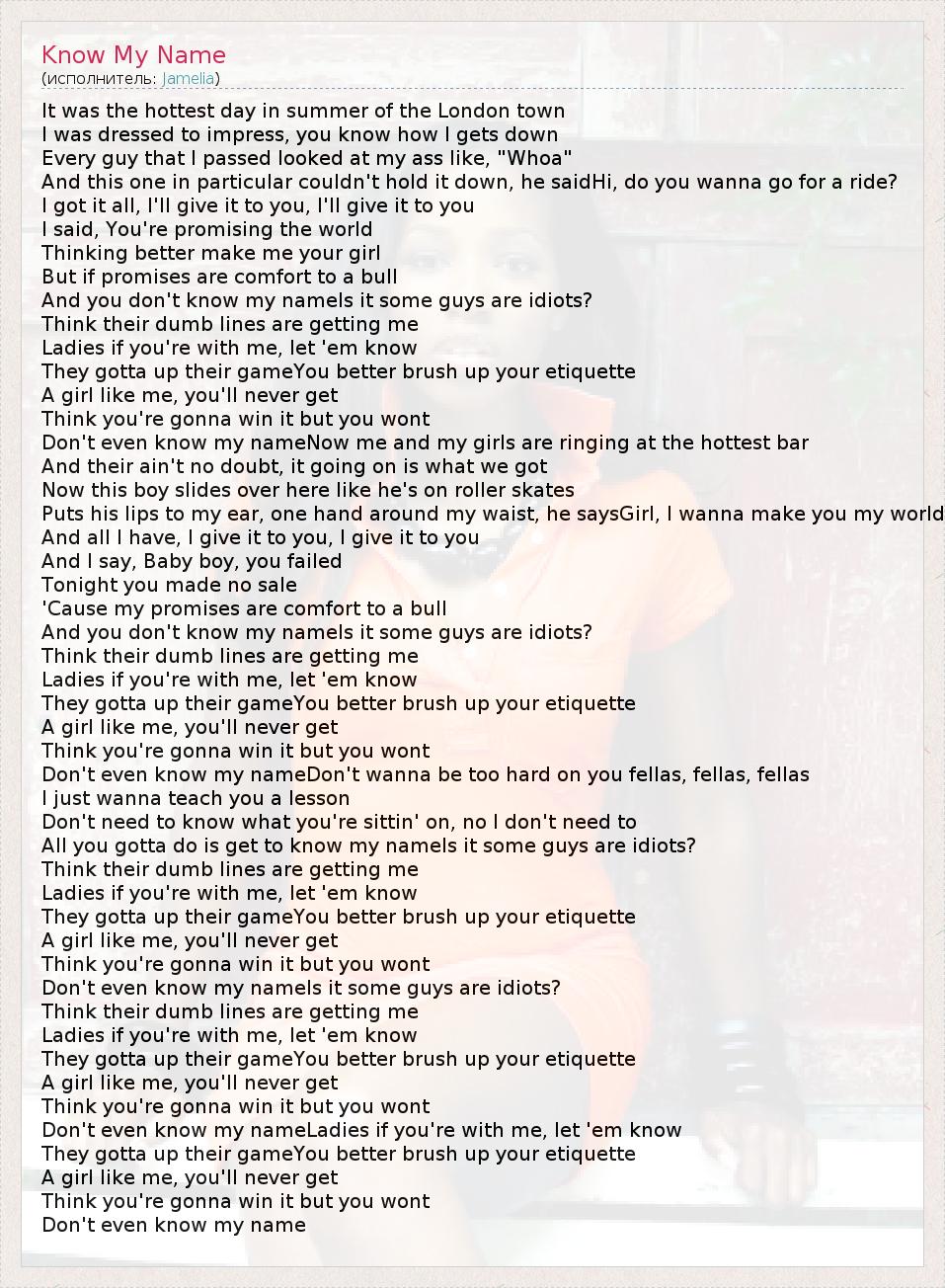 It was the hottest day in summer of the London town I was dressed to impress, you know how I gets down Every guy that I passed looked at my ass like, "Whoa" And this one in particular couldn't hold it down, he saidHi, do you wanna go for a ride? I got it all, I'll give it to you, I'll give it to you I said, You're promising the world Thinking better make me your girl But if promises are comfort to a bull And you don't know my nameIs it some guys are idiots? Think their dumb lines are getting me Ladies if you're with me, let 'em know They gotta up their gameYou better brush up your etiquette A girl like me, you'll never get Think you're gonna win it but you wont Don't even know my nameNow me and my girls are ringing at the hottest bar And their ain't no doubt, it going on is what we got Now this boy slides over here like he's on roller skates Puts his lips to my ear, one hand around my waist, he saysGirl, I wanna make you my world And all I have, I give it to you, I give it to you And I say, Baby boy, you failed Tonight you made no sale 'Cause my promises are comfort to a bull And you don't know my nameIs it some guys are idiots? Think their dumb lines are getting me Ladies if you're with me, let 'em know They gotta up their gameYou better brush up your etiquette A girl like me, you'll never get Think you're gonna win it but you wont Don't even know my nameDon't wanna be too hard on you fellas, fellas, fellas I just wanna teach you a lesson Don't need to know what you're sittin' on, no I don't need to All you gotta do is get to know my nameIs it some guys are idiots? Think their dumb lines are getting me Ladies if you're with me, let 'em know They gotta up their gameYou better brush up your etiquette A girl like me, you'll never get Think you're gonna win it but you wont Don't even know my nameIs it some guys are idiots? Think their dumb lines are getting me Ladies if you're with me, let 'em know They gotta up their gameYou better brush up your etiquette A girl like me, you'll never get Think you're gonna win it but you wont Don't even know my nameLadies if you're with me, let 'em know They gotta up their gameYou better brush up your etiquette A girl like me, you'll never get Think you're gonna win it but you wont Don't even know my name