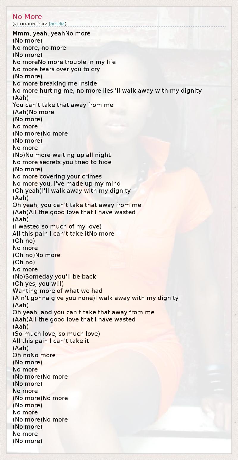 Mmm, yeah, yeahNo more (No more) No more, no more (No more) No moreNo more trouble in my life No more tears over you to cry (No more) No more breaking me inside No more hurting me, no more liesI'll walk away with my dignity (Aah) You can't take that away from me (Aah)No more (No more) No more (No more)No more (No more) No more (No)No more waiting up all night No more secrets you tried to hide (No more) No more covering your crimes No more you, I've made up my mind (Oh yeah)I'll walk away with my dignity (Aah) Oh yeah, you can't take that away from me (Aah)All the good love that I have wasted (Aah) (I wasted so much of my love) All this pain I can't take itNo more (Oh no) No more (Oh no)No more (Oh no) No more (No)Someday you'll be back (Oh yes, you will) Wanting more of what we had (Ain't gonna give you none)I walk away with my dignity (Aah) Oh yeah, and you can't take that away from me (Aah)All the good love that I have wasted (Aah) (So much love, so much love) All this pain I can't take it (Aah) Oh noNo more (No more) No more (No more)No more (No more) No more (No more)No more (No more) No more (No more)No more (No more) No more (No more)