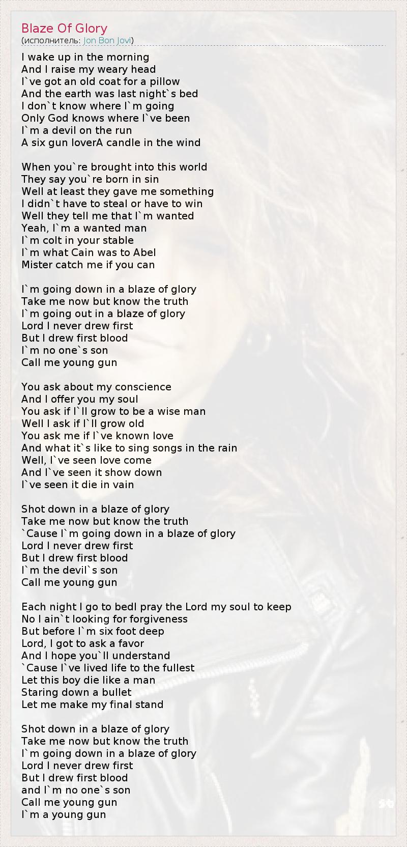 I wake up in the morning And I raise my weary head I`ve got an old coat for a pillow And the earth was last night`s bed I don`t know where I`m going Only God knows where I`ve been I`m a devil on the run A six gun loverA candle in the wind When you`re brought into this world They say you`re born in sin Well at least they gave me something I didn`t have to steal or have to win Well they tell me that I`m wanted Yeah, I`m a wanted man I`m colt in your stable I`m what Cain was to Abel Mister catch me if you can I`m going down in a blaze of glory Take me now but know the truth I`m going out in a blaze of glory Lord I never drew first But I drew first blood I`m no one`s son Call me young gun You ask about my conscience And I offer you my soul You ask if I`ll grow to be a wise man Well I ask if I`ll grow old You ask me if I`ve known love And what it`s like to sing songs in the rain Well, I`ve seen love come And I`ve seen it show down I`ve seen it die in vain Shot down in a blaze of glory Take me now but know the truth `Cause I`m going down in a blaze of glory Lord I never drew first But I drew first blood I`m the devil`s son Call me young gun Each night I go to bedI pray the Lord my soul to keep No I ain`t looking for forgiveness But before I`m six foot deep Lord, I got to ask a favor And I hope you`ll understand `Cause I`ve lived life to the fullest Let this boy die like a man Staring down a bullet Let me make my final stand Shot down in a blaze of glory Take me now but know the truth I`m going down in a blaze of glory Lord I never drew first But I drew first blood and I`m no one`s son Call me young gun I`m a young gun