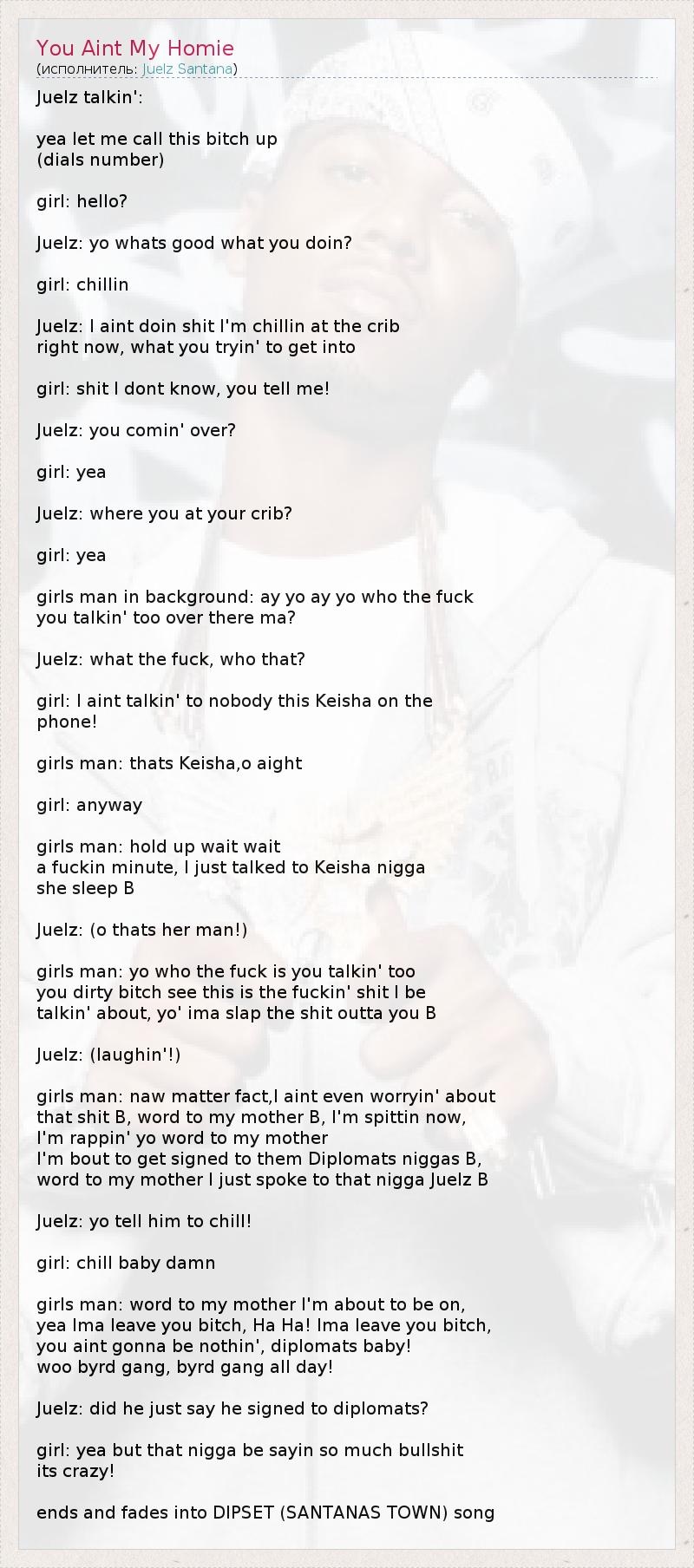 Juelz talkin': yea let me call this bitch up (dials number) girl: hello? Juelz: yo whats good what you doin? girl: chillin Juelz: I aint doin shit I'm chillin at the crib right now, what you tryin' to get into girl: shit I dont know, you tell me! Juelz: you comin' over? girl: yea Juelz: where you at your crib? girl: yea girls man in background: ay yo ay yo who the fuck you talkin' too over there ma? Juelz: what the fuck, who that? girl: I aint talkin' to nobody this Keisha on the phone! girls man: thats Keisha,o aight girl: anyway girls man: hold up wait wait a fuckin minute, I just talked to Keisha nigga she sleep B Juelz: (o thats her man!) girls man: yo who the fuck is you talkin' too you dirty bitch see this is the fuckin' shit I be talkin' about, yo' ima slap the shit outta you B Juelz: (laughin'!) girls man: naw matter fact,I aint even worryin' about that shit B, word to my mother B, I'm spittin now, I'm rappin' yo word to my mother I'm bout to get signed to them Diplomats niggas B, word to my mother I just spoke to that nigga Juelz B Juelz: yo tell him to chill! girl: chill baby damn girls man: word to my mother I'm about to be on, yea Ima leave you bitch, Ha Ha! Ima leave you bitch, you aint gonna be nothin', diplomats baby! woo byrd gang, byrd gang all day! Juelz: did he just say he signed to diplomats? girl: yea but that nigga be sayin so much bullshit its crazy! ends and fades into DIPSET (SANTANAS TOWN) song