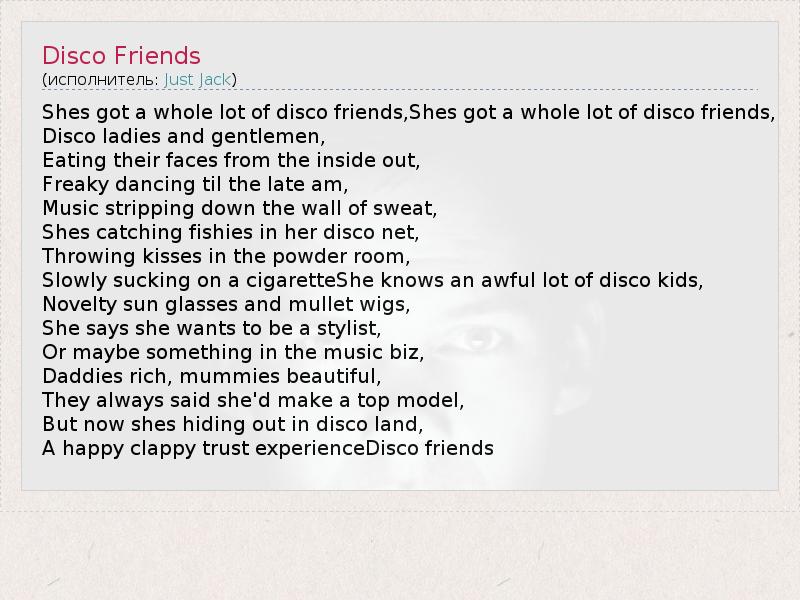 Shes got a whole lot of disco friends,Shes got a whole lot of disco friends, Disco ladies and gentlemen, Eating their faces from the inside out, Freaky dancing til the late am, Music stripping down the wall of sweat, Shes catching fishies in her disco net, Throwing kisses in the powder room, Slowly sucking on a cigaretteShe knows an awful lot of disco kids, Novelty sun glasses and mullet wigs, She says she wants to be a stylist, Or maybe something in the music biz, Daddies rich, mummies beautiful, They always said she'd make a top model, But now shes hiding out in disco land, A happy clappy trust experienceDisco friends