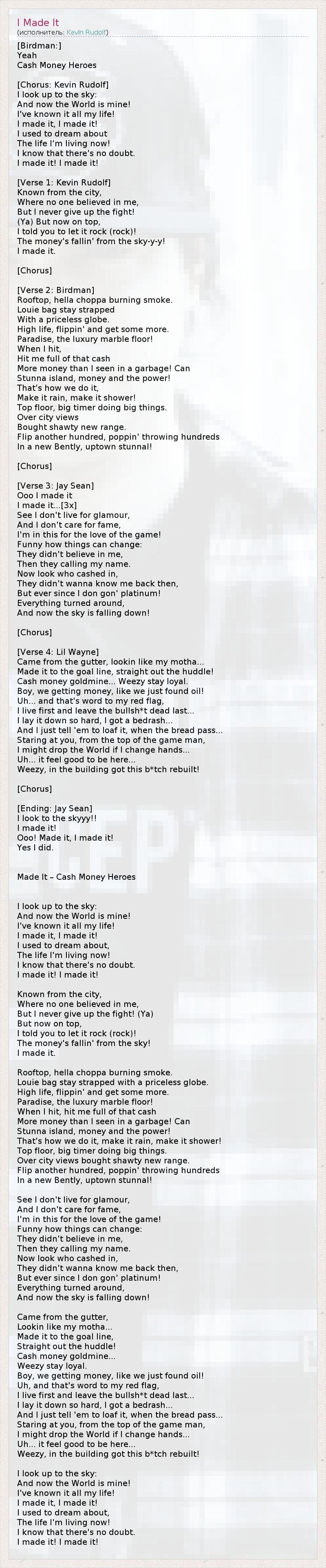 Это интересно:Kevin Rudolf - американский музыкант, который позиционирует свою музыку как смесь рока и рэпа. Подписан на Cash Money.Кевин Рудольф родился в 1983 году в Нью-Йорке (США), но после развода родителей он рос с мамой в Майами, штат Флорида. И именно его мать призвала мальчика учиться музыке; так в двенадцать лет Кевин узнает о гитаре. Он быстро понял, что это за инструмент, и научился неплохо играть. Также... продолжение
