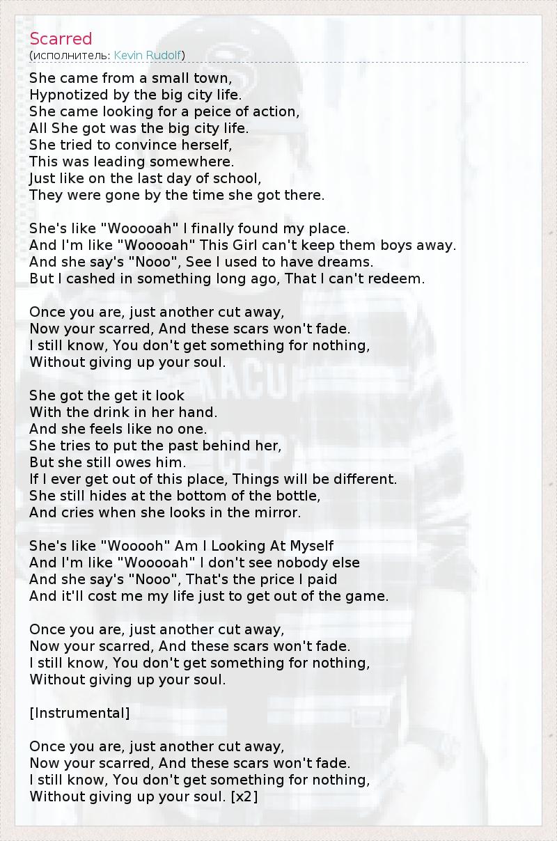 She came from a small town, Hypnotized by the big city life. She came looking for a peice of action, All She got was the big city life. She tried to convince herself, This was leading somewhere. Just like on the last day of school, They were gone by the time she got there. She's like "Wooooah" I finally found my place. And I'm like "Wooooah" This Girl can't keep them boys away. And she say's "Nooo", See I used to have dreams. But I cashed in something long ago, That I can't redeem. Once you are, just another cut away, Now your scarred, And these scars won't fade. I still know, You don't get something for nothing, Without giving up your soul. She got the get it look With the drink in her hand. And she feels like no one. She tries to put the past behind her, But she still owes him. If I ever get out of this place, Things will be different. She still hides at the bottom of the bottle, And cries when she looks in the mirror. She's like "Wooooh" Am I Looking At Myself And I'm like "Wooooah" I don't see nobody else And she say's "Nooo", That's the price I paid And it'll cost me my life just to get out of the game. Once you are, just another cut away, Now your scarred, And these scars won't fade. I still know, You don't get something for nothing, Without giving up your soul. [Instrumental] Once you are, just another cut away, Now your scarred, And these scars won't fade. I still know, You don't get something for nothing, Without giving up your soul. [x2]