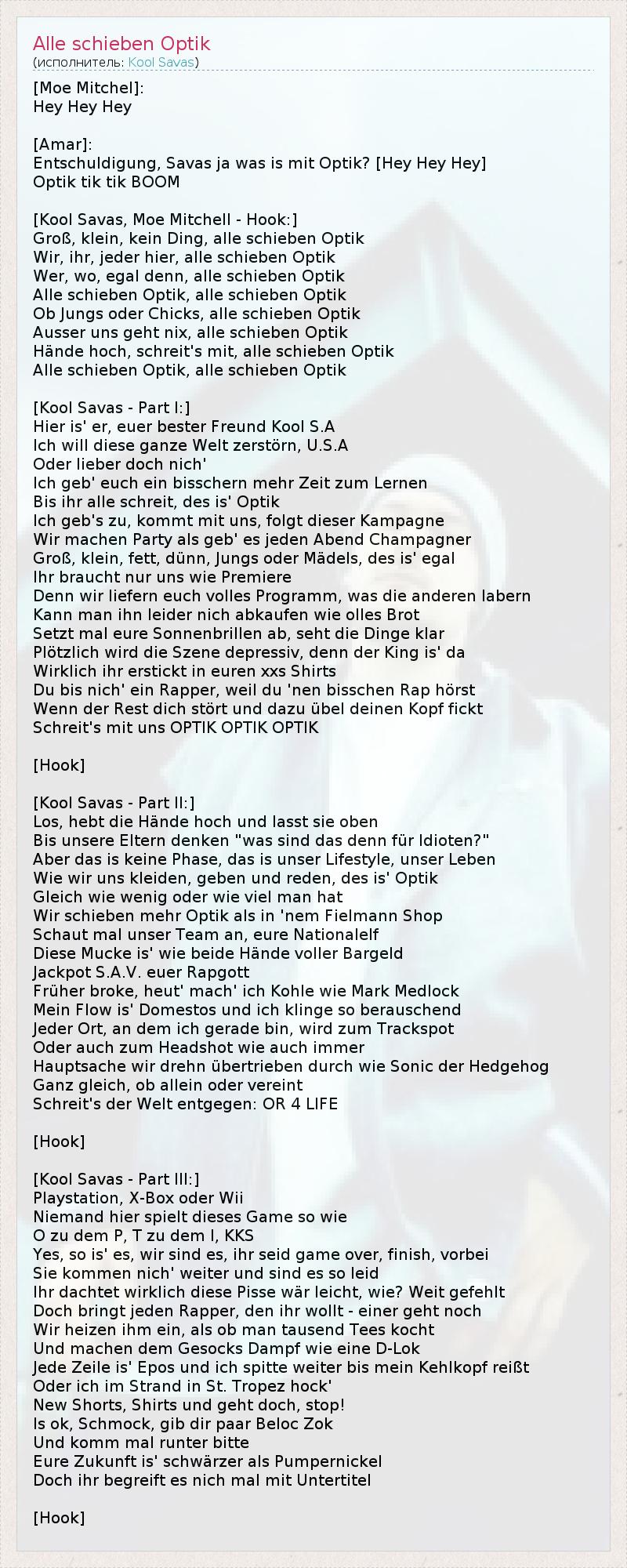 [Moe Mitchel]: Hey Hey Hey [Amar]: Entschuldigung, Savas ja was is mit Optik? [Hey Hey Hey] Optik tik tik BOOM [Kool Savas, Moe Mitchell - Hook:] Groß, klein, kein Ding, alle schieben Optik Wir, ihr, jeder hier, alle schieben Optik Wer, wo, egal denn, alle schieben Optik Alle schieben Optik, alle schieben Optik Ob Jungs oder Chicks, alle schieben Optik Ausser uns geht nix, alle schieben Optik Hände hoch, schreit's mit, alle schieben Optik Alle schieben Optik, alle schieben Optik [Kool Savas - Part I:] Hier is' er, euer bester Freund Kool S.A Ich will diese ganze Welt zerstörn, U.S.A Oder lieber doch nich' Ich geb' euch ein bisschern mehr Zeit zum Lernen Bis ihr alle schreit, des is' Optik Ich geb's zu, kommt mit uns, folgt dieser Kampagne Wir machen Party als geb' es jeden Abend Champagner Groß, klein, fett, dünn, Jungs oder Mädels, des is' egal Ihr braucht nur uns wie Premiere Denn wir liefern euch volles Programm, was die anderen labern Kann man ihn leider nich abkaufen wie olles Brot Setzt mal eure Sonnenbrillen ab, seht die Dinge klar Plötzlich wird die Szene depressiv, denn der King is' da Wirklich ihr erstickt in euren xxs Shirts Du bis nich' ein Rapper, weil du 'nen bisschen Rap hörst Wenn der Rest dich stört und dazu übel deinen Kopf fickt Schreit's mit uns OPTIK OPTIK OPTIK [Hook] [Kool Savas - Part II:] Los, hebt die Hände hoch und lasst sie oben Bis unsere Eltern denken "was sind das denn für Idioten?" Aber das is keine Phase, das is unser Lifestyle, unser Leben Wie wir uns kleiden, geben und reden, des is' Optik Gleich wie wenig oder wie viel man hat Wir schieben mehr Optik als in 'nem Fielmann Shop Schaut mal unser Team an, eure Nationalelf Diese Mucke is' wie beide Hände voller Bargeld Jackpot S.A.V. euer Rapgott Früher broke, heut' mach' ich Kohle wie Mark Medlock Mein Flow is' Domestos und ich klinge so berauschend Jeder Ort, an dem ich gerade bin, wird zum Trackspot Oder auch zum Headshot wie auch immer Hauptsache wir drehn übertrieben durch wie Sonic der Hedgehog Ganz gleich, ob allein oder vereint Schreit's der Welt entgegen: OR 4 LIFE [Hook] [Kool Savas - Part III:] Playstation, X-Box oder Wii Niemand hier spielt dieses Game so wie O zu dem P, T zu dem I, KKS Yes, so is' es, wir sind es, ihr seid game over, finish, vorbei Sie kommen nich' weiter und sind es so leid Ihr dachtet wirklich diese Pisse wär leicht, wie? Weit gefehlt Doch bringt jeden Rapper, den ihr wollt - einer geht noch Wir heizen ihm ein, als ob man tausend Tees kocht Und machen dem Gesocks Dampf wie eine D-Lok Jede Zeile is' Epos und ich spitte weiter bis mein Kehlkopf reißt Oder ich im Strand in St. Tropez hock' New Shorts, Shirts und geht doch, stop! Is ok, Schmock, gib dir paar Beloc Zok Und komm mal runter bitte Eure Zukunft is' schwärzer als Pumpernickel Doch ihr begreift es nich mal mit Untertitel [Hook]
