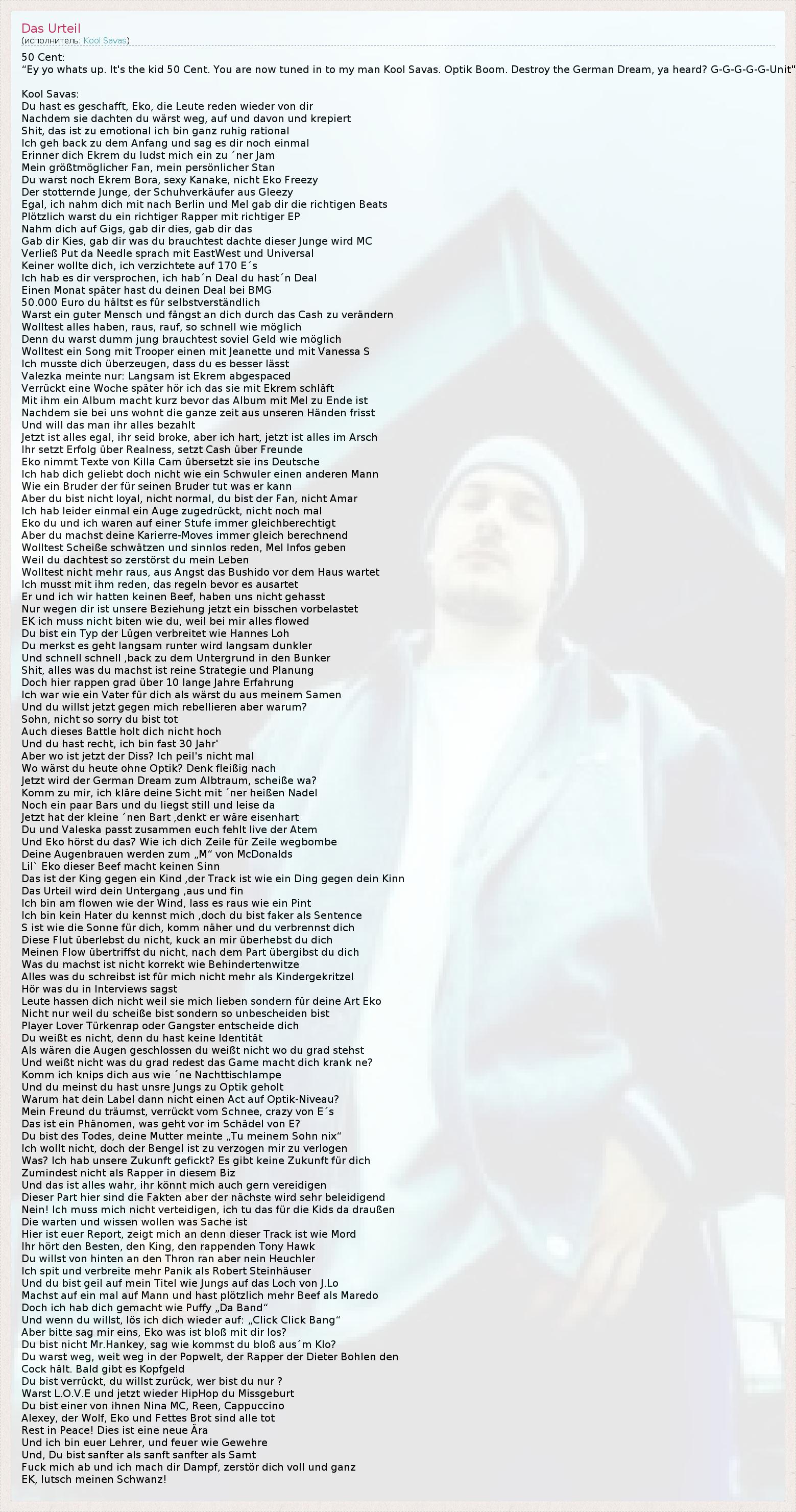 “Ey yo whats up. It's the kid 50 Cent. You are now tuned in to my man Kool Savas. Optik Boom. Destroy the German Dream, ya heard? G-G-G-G-G-Unit"