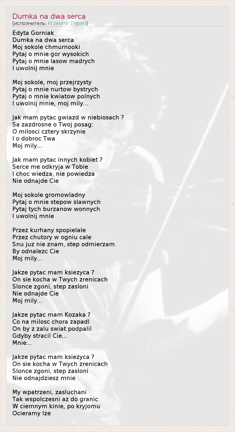 Edyta Gorniak Dumka na dwa serca Moj sokole chmurnooki Pytaj o mnie gor wysokich Pytaj o mnie lasow madrych I uwolnij mnie Moj sokole, moj przejrzysty Pytaj o mnie nurtow bystrych Pytaj o mnie kwiatow polnych I uwolnij mnie, moj mily... Jak mam pytac gwiazd w niebiosach ? Sa zazdrosne o Twoj posag: O milosci cztery skrzynie I o dobroc Twa Moj mily... Jak mam pytac innych kobiet ? Serce me odkryja w Tobie I choc wiedza, nie powiedza Nie odnajde Cie Moj sokole gromowladny Pytaj o mnie stepow slawnych Pytaj tych burzanow wonnych I uwolnij mnie Przez kurhany spopielale Przez chutory w ogniu cale Snu juz nie znam, step odmierzam By odnalezc Cie Moj mily... Jakze pytac mam ksiezyca ? On sie kocha w Twych zrenicach Slonce zgoni, step zasloni Nie odnajde Cie Moj mily... Jakze pytac mam Kozaka ? Co na milosc chora zapadl On by z zalu swiat podpalil Gdyby stracil Cie... Mnie... Jakze pytac mam ksiezyca ? On sie kocha w Twych zrenicach Slonce zgoni, step zasloni Nie odnajdziesz mnie My wpatrzeni, zasluchani Tak wspolczesni az do granic W ciemnym kinie, po kryjomu Ocieramy lze