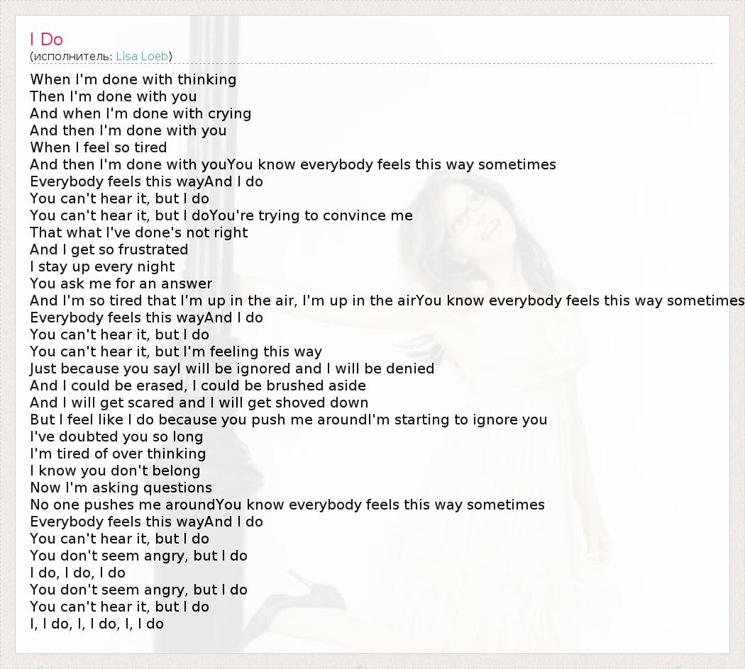 When I'm done with thinking Then I'm done with you And when I'm done with crying And then I'm done with you When I feel so tired And then I'm done with youYou know everybody feels this way sometimes Everybody feels this wayAnd I do You can't hear it, but I do You can't hear it, but I doYou're trying to convince me That what I've done's not right And I get so frustrated I stay up every night You ask me for an answer And I'm so tired that I'm up in the air, I'm up in the airYou know everybody feels this way sometimes Everybody feels this wayAnd I do You can't hear it, but I do You can't hear it, but I'm feeling this way Just because you sayI will be ignored and I will be denied And I could be erased, I could be brushed aside And I will get scared and I will get shoved down But I feel like I do because you push me aroundI'm starting to ignore you I've doubted you so long I'm tired of over thinking I know you don't belong Now I'm asking questions No one pushes me aroundYou know everybody feels this way sometimes Everybody feels this wayAnd I do You can't hear it, but I do You don't seem angry, but I do I do, I do, I do You don't seem angry, but I do You can't hear it, but I do I, I do, I, I do, I, I do