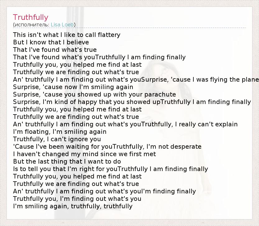 This isn't what I like to call flattery But I know that I believe That I've found what's true That I've found what's youTruthfully I am finding finally Truthfully you, you helped me find at last Truthfully we are finding out what's true An' truthfully I am finding out what's youSurprise, 'cause I was flying the plane Surprise, 'cause now I'm smiling again Surprise, 'cause you showed up with your parachute Surprise, I'm kind of happy that you showed upTruthfully I am finding finally Truthfully you, you helped me find at last Truthfully we are finding out what's true An' truthfully I am finding out what's youTruthfully, I really can't explain I'm floating, I'm smiling again Truthfully, I can't ignore you 'Cause I've been waiting for youTruthfully, I'm not desperate I haven't changed my mind since we first met But the last thing that I want to do Is to tell you that I'm right for youTruthfully I am finding finally Truthfully you, you helped me find at last Truthfully we are finding out what's true An' truthfully I am finding out what's youI'm finding finally Truthfully you, I'm finding out what's you I'm smiling again, truthfully, truthfully